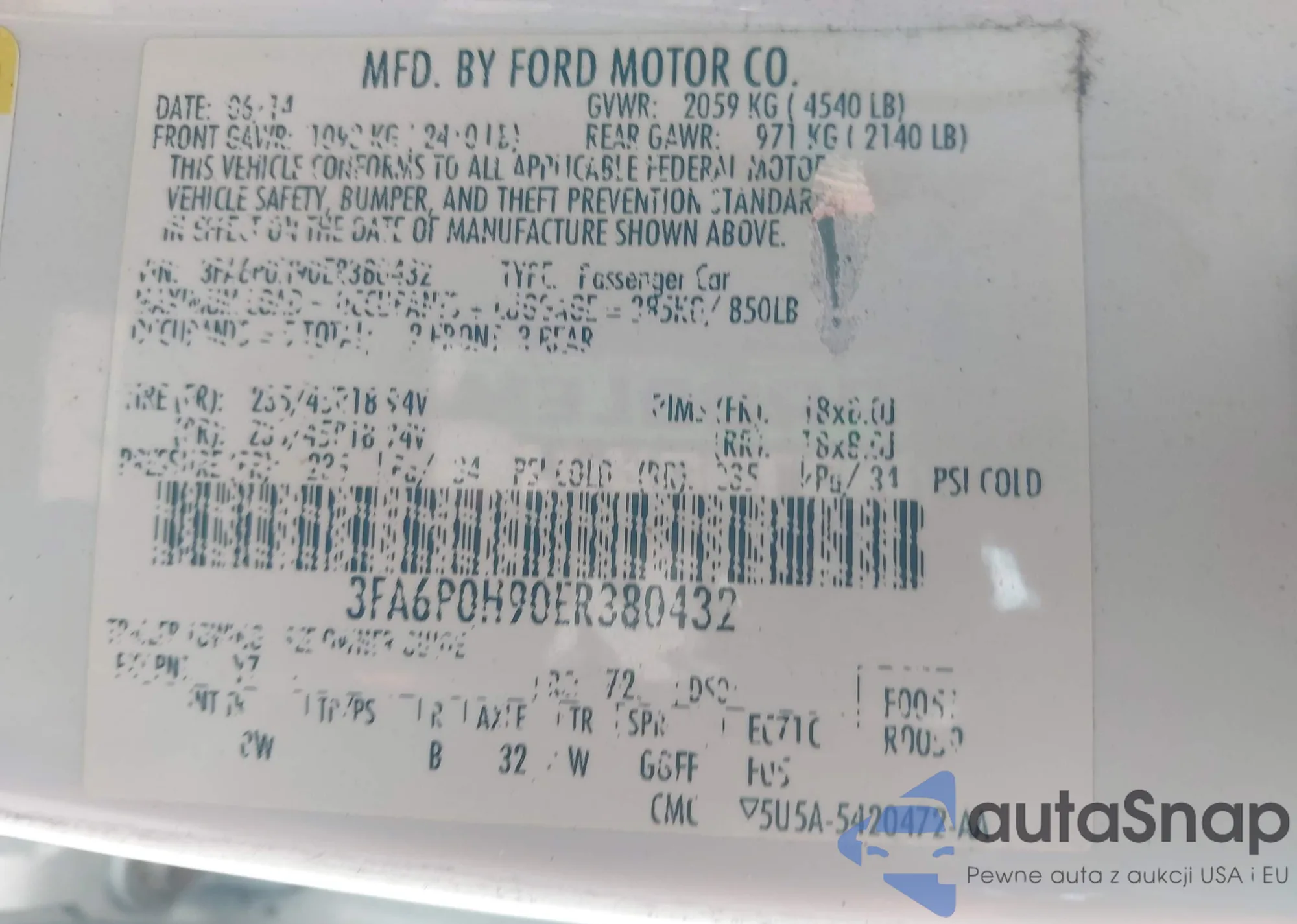 VIN: 3FA6P0H90ER380432