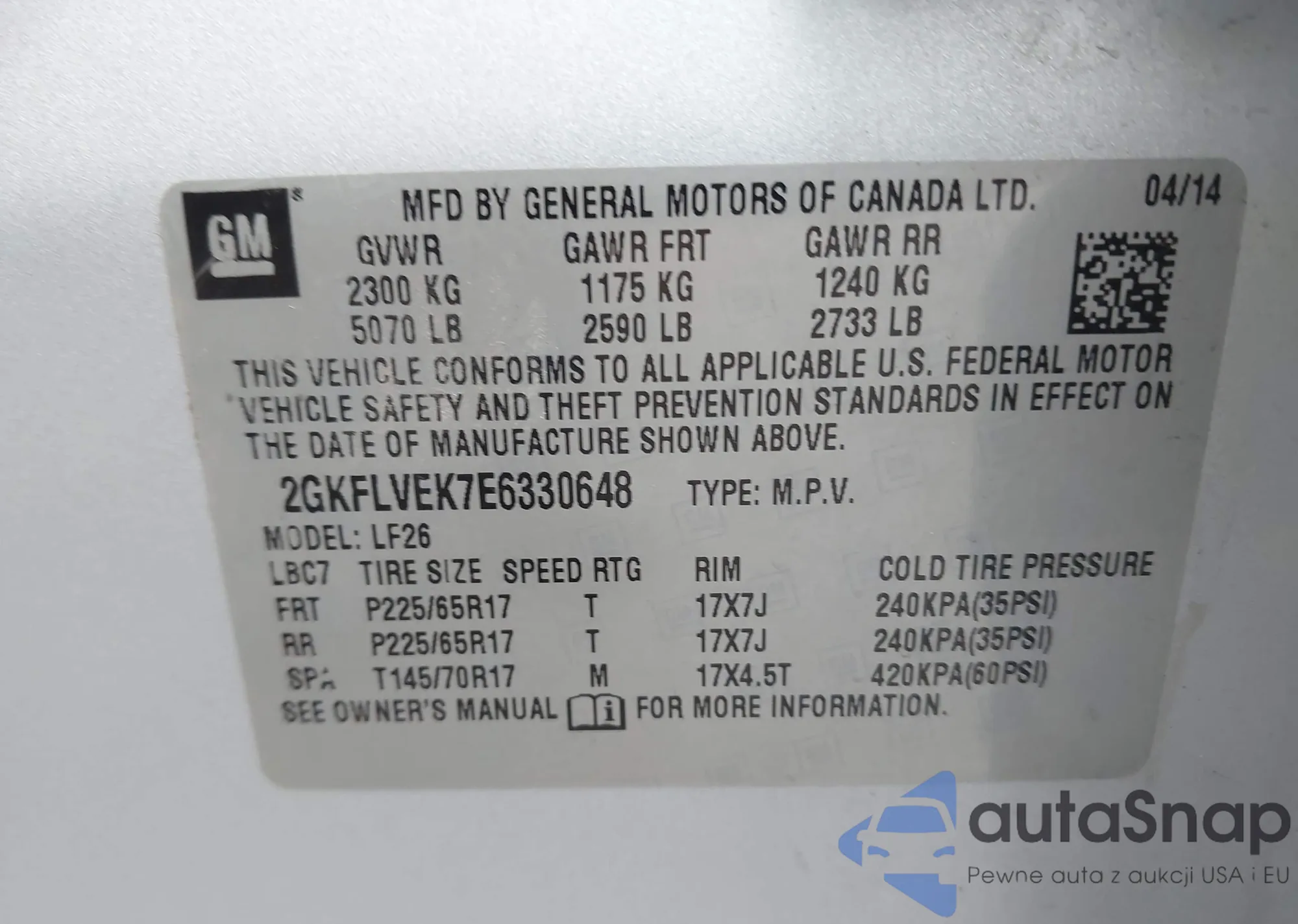 The car GMC Terrain 2014 (VIN 2GKFLVEK7E6330648) has not been auctioned before. The documents are clean, and the mileage matches or is below the market average. Sold by an insurance company – we recommend purchase. Delivery to the port will take approx. 6–8 weeks.