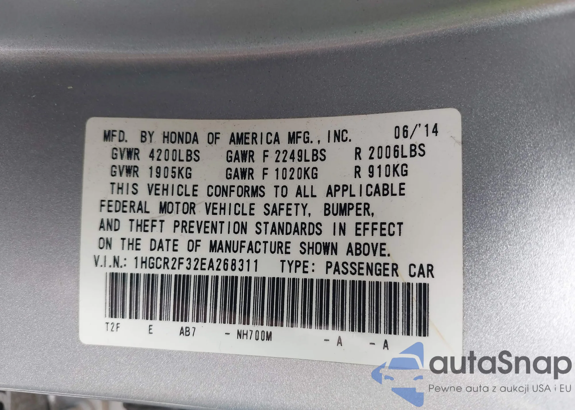 • VIN: 1HGCR2F32EA268311