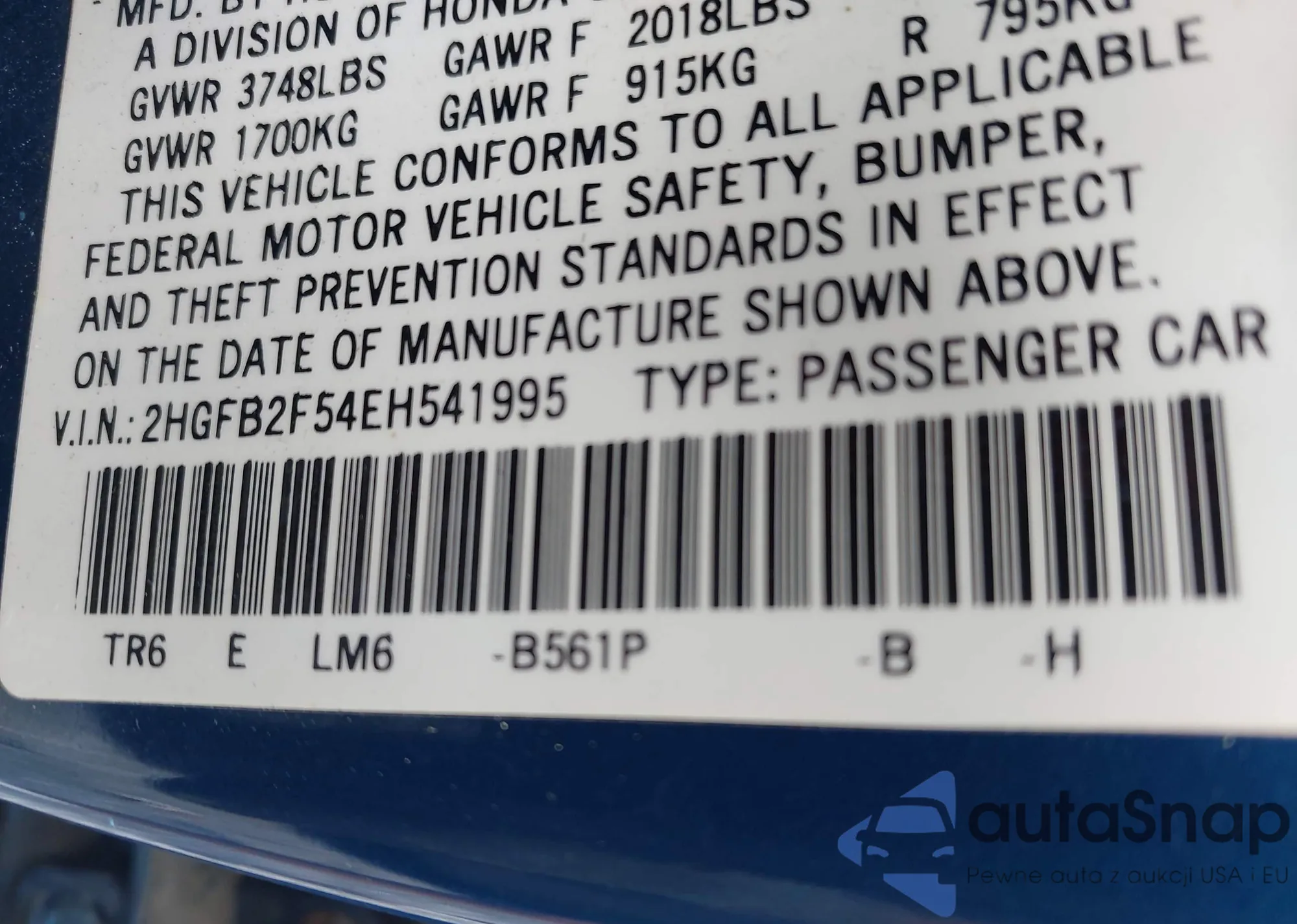VIN: 2HGFB2F54EH541995