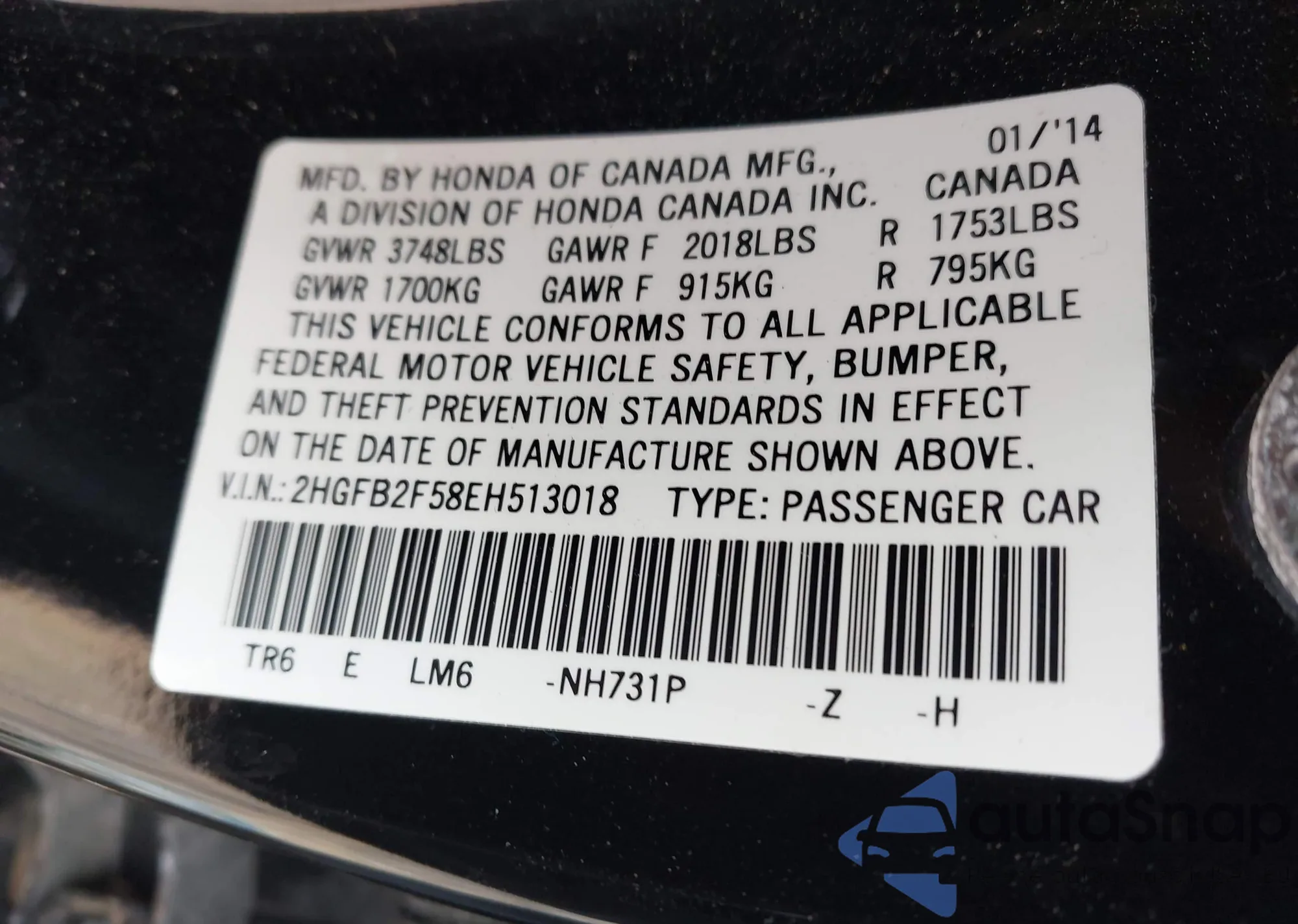 VIN: 2HGFB2F58EH513018