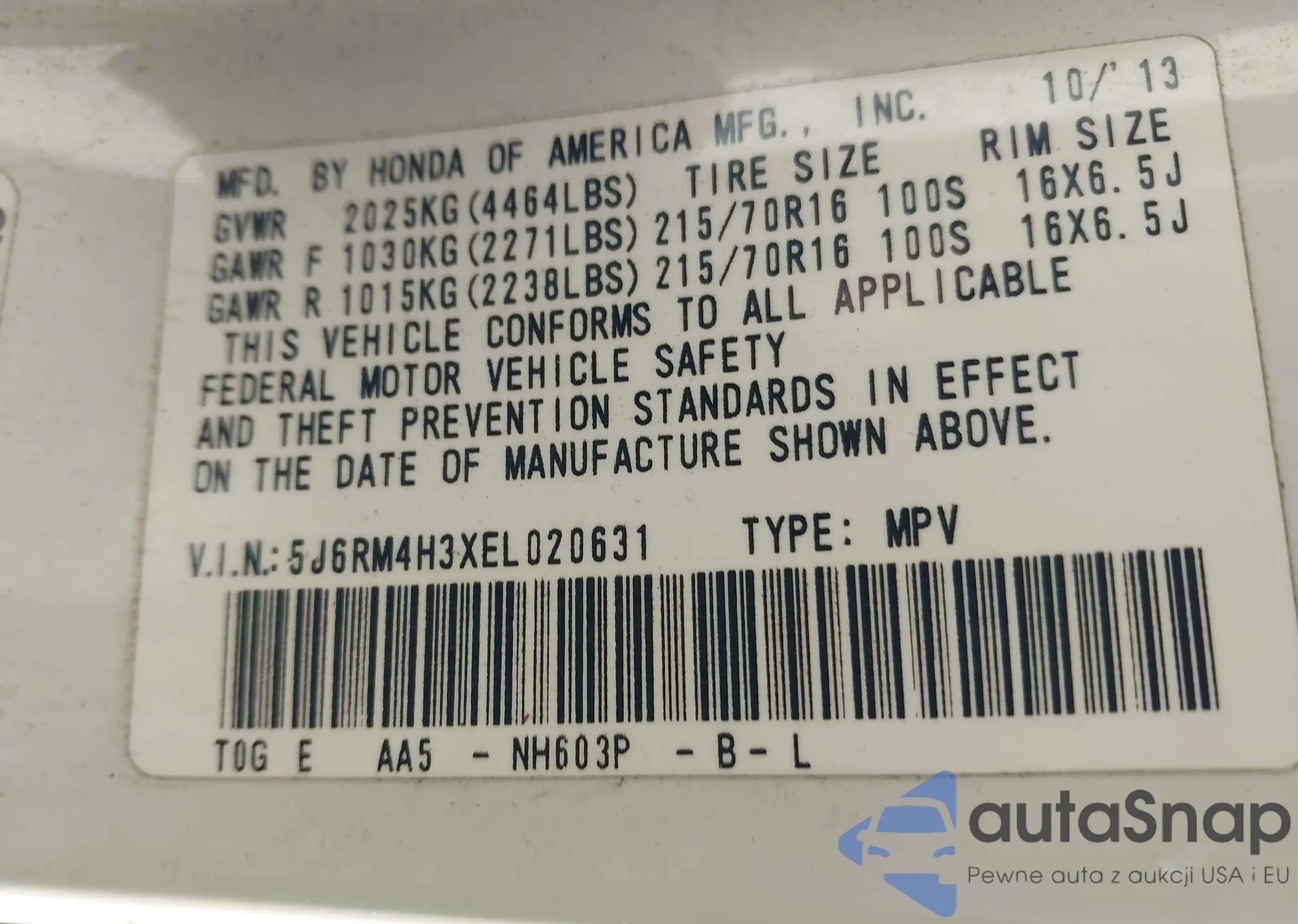 The car Honda CR-V 2014 (VIN 5J6RM4H3XEL020631) has not been auctioned before. The documents are clean, and the mileage matches or is below the market average. Sold by an insurance company – we recommend purchase. Delivery to the port will take approx. 6–8 weeks.