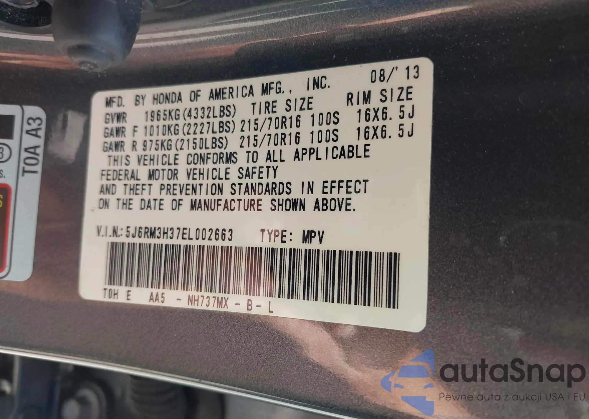 • VIN: 5J6RM3H37EL002663