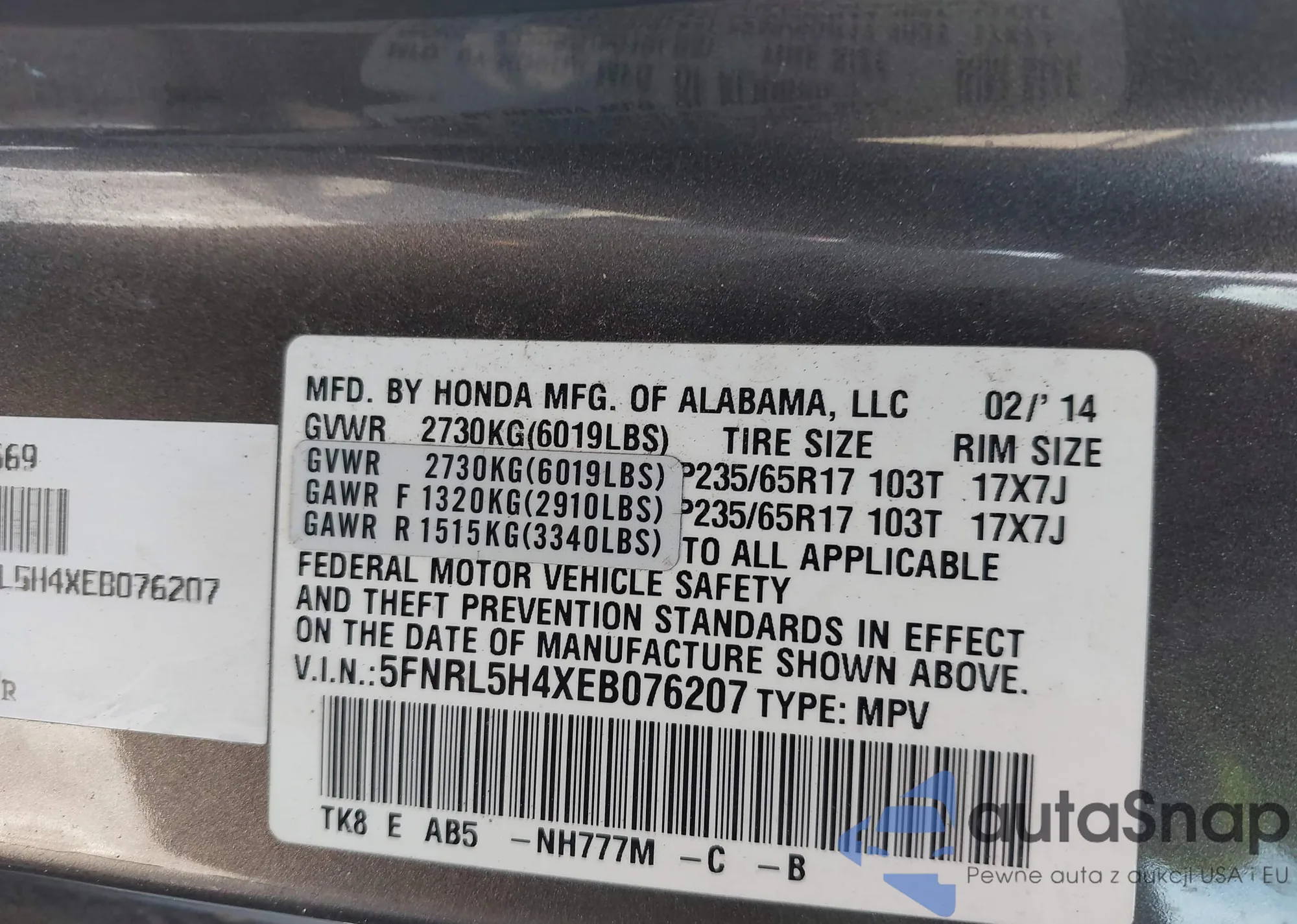 The car Honda Odyssey 2014 (VIN 5FNRL5H4XEB076207) is sold by an unverified seller. We recommend checking the Carfax report and confirming registration possibilities before purchase.