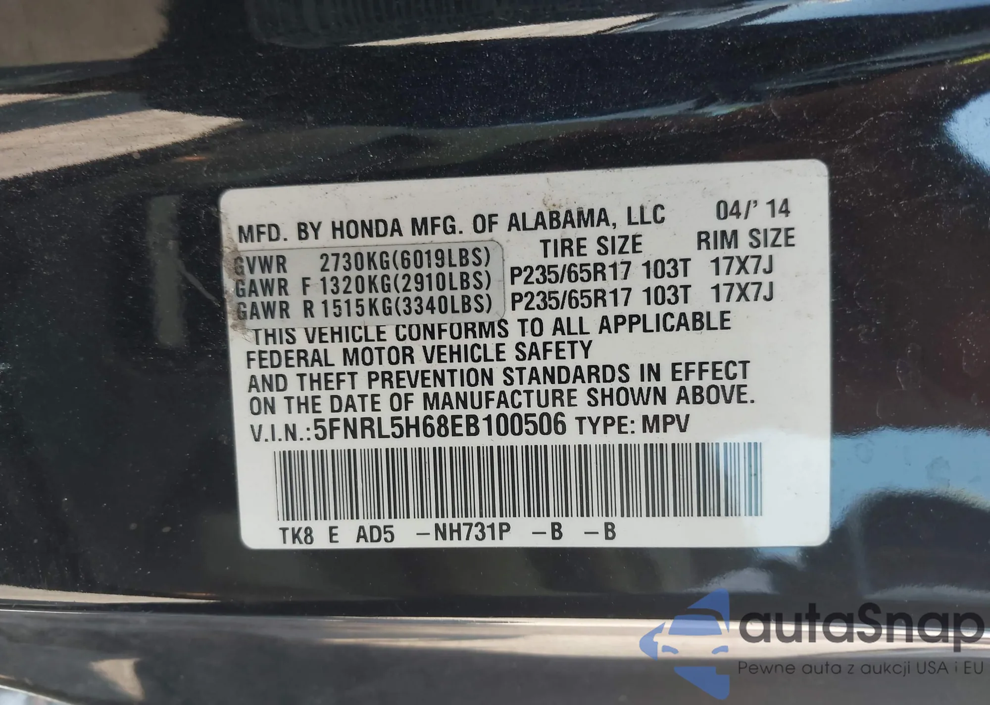 VIN: 5FNRL5H68EB100506