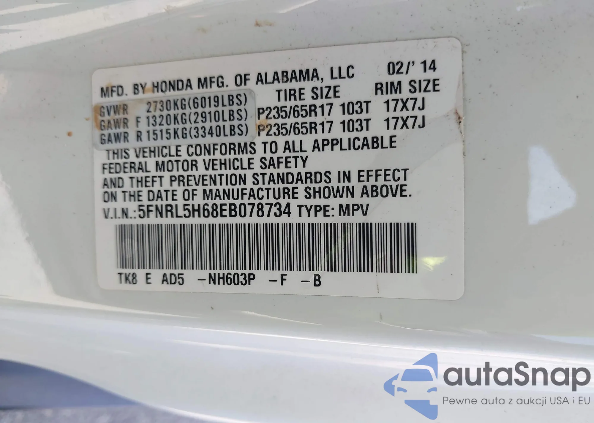 VIN: 5FNRL5H68EB078734