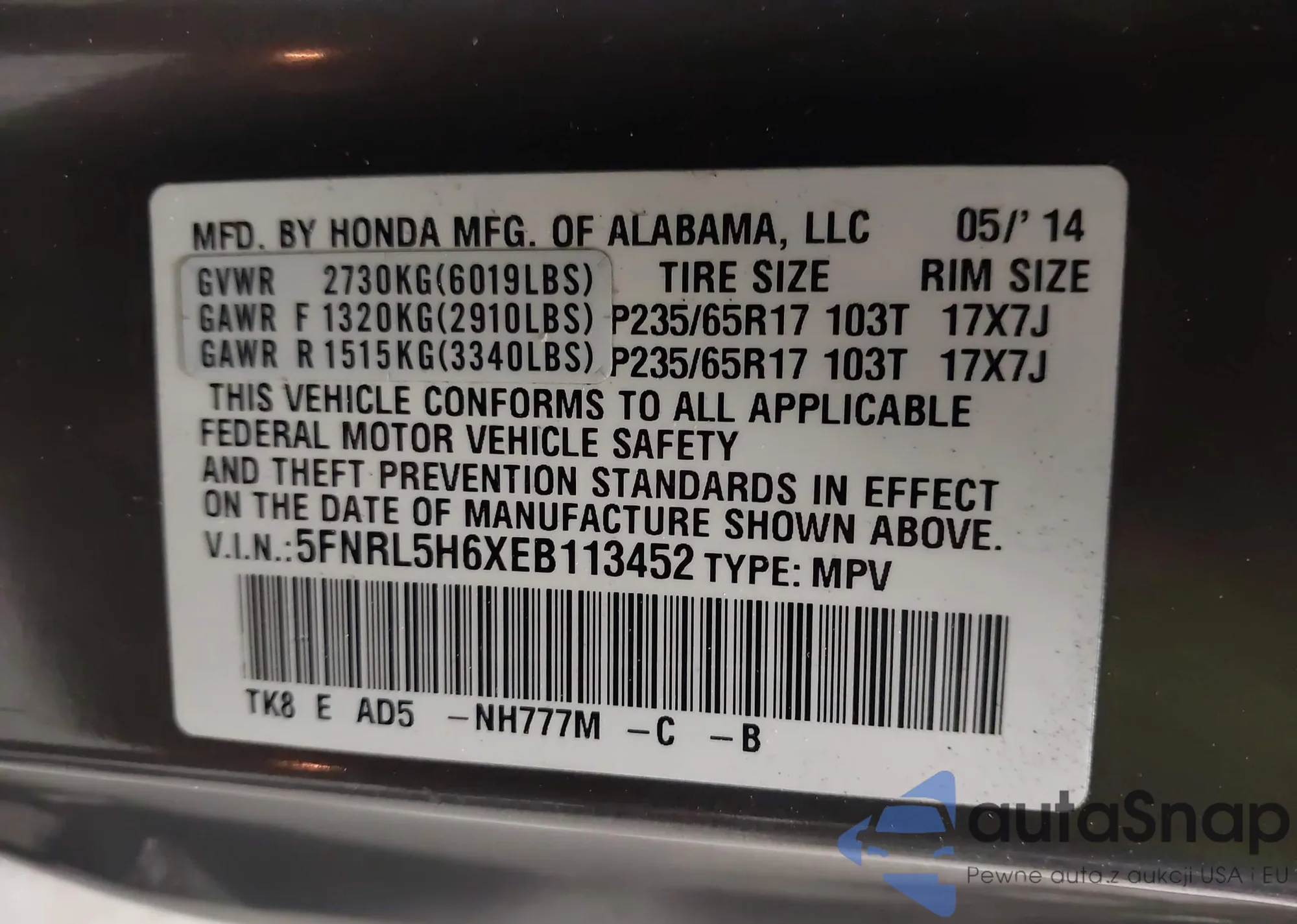 • VIN: 5FNRL5H6XEB113452