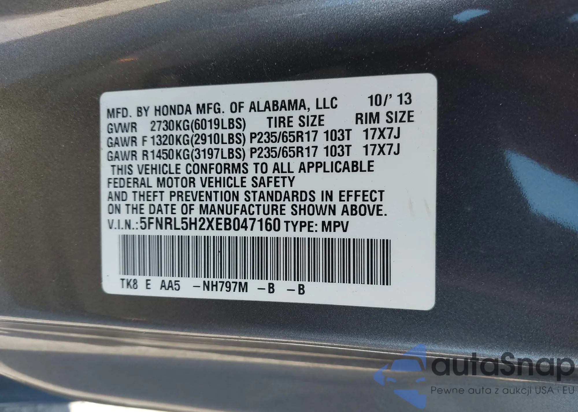 • VIN: 5FNRL5H2XEB047160