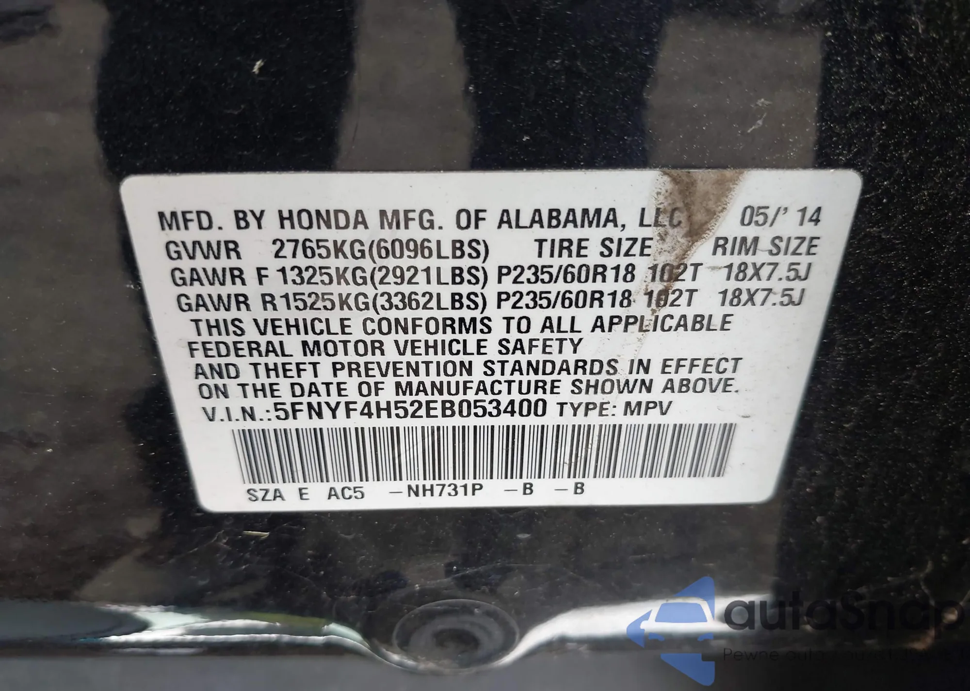 VIN: 5FNYF4H52EB053400