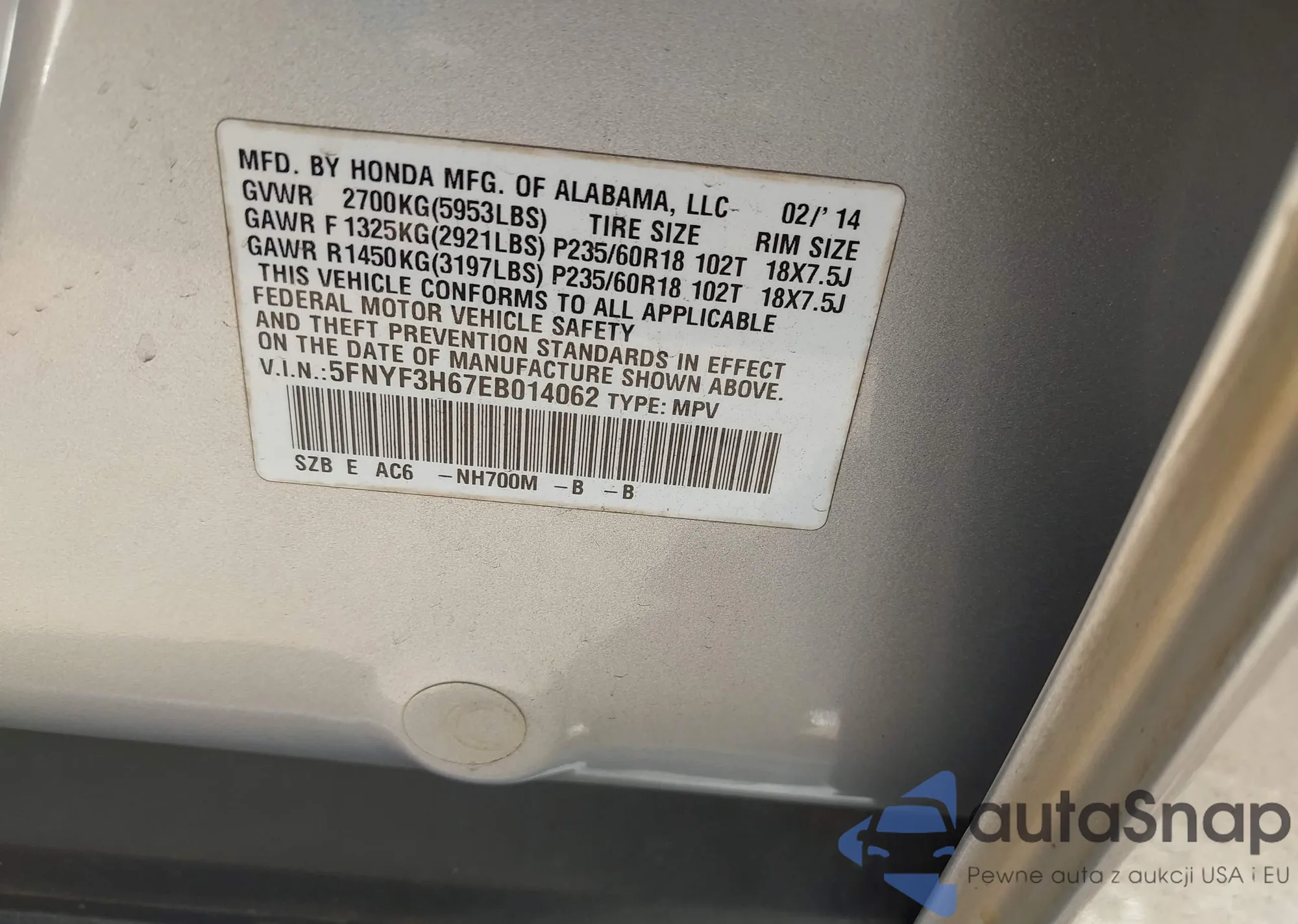 • VIN: 5FNYF3H67EB014062