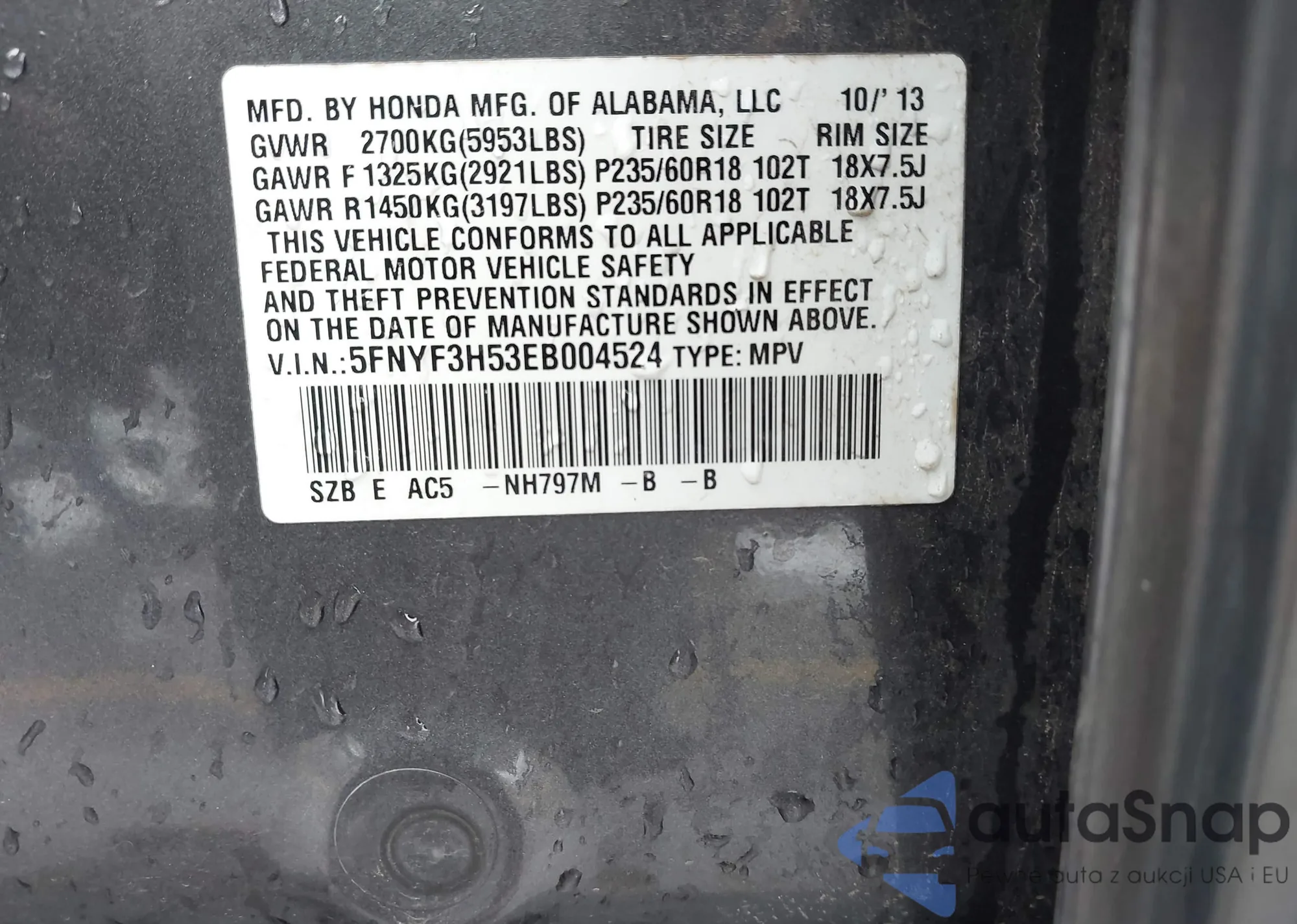 • VIN: 5FNYF3H53EB004524