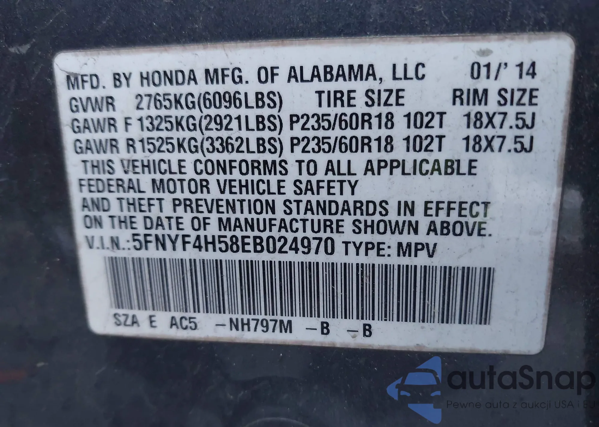 The car Honda Pilot 2014 (VIN 5FNYF4H58EB024970) has not been auctioned before. The documents are clean, and the mileage matches or is below the market average. Sold by an insurance company – we recommend purchase. Delivery to the port will take approx. 6–8 weeks.