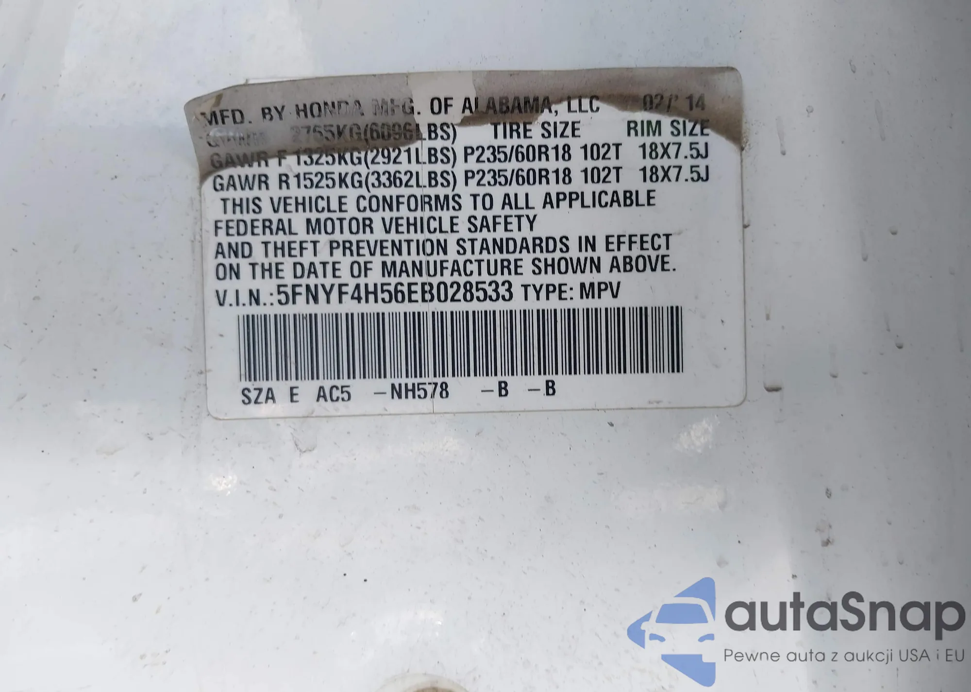 VIN: 5FNYF4H56EB028533