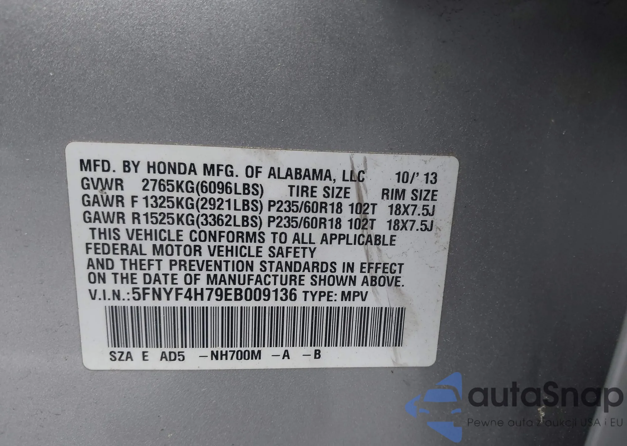 VIN: 5FNYF4H79EB009136