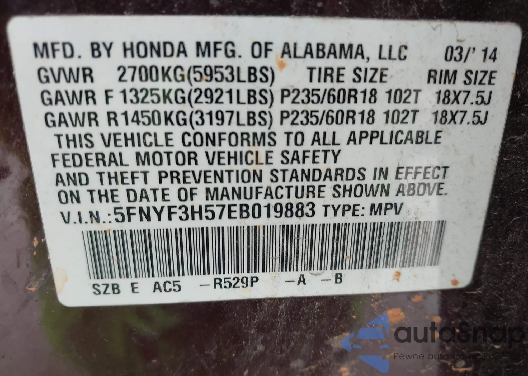 • VIN: 5FNYF3H57EB019883