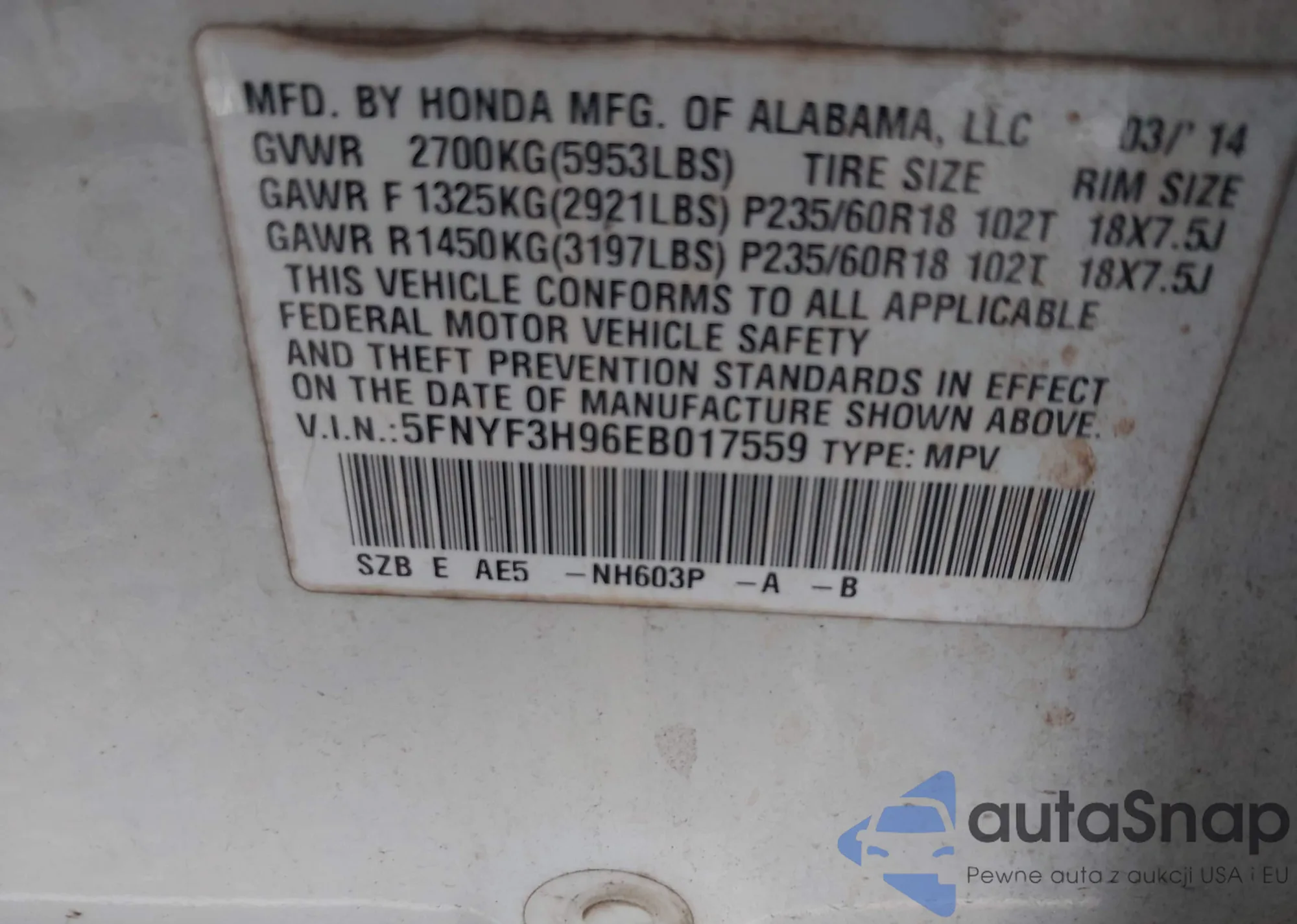 VIN: 5FNYF3H96EB017559