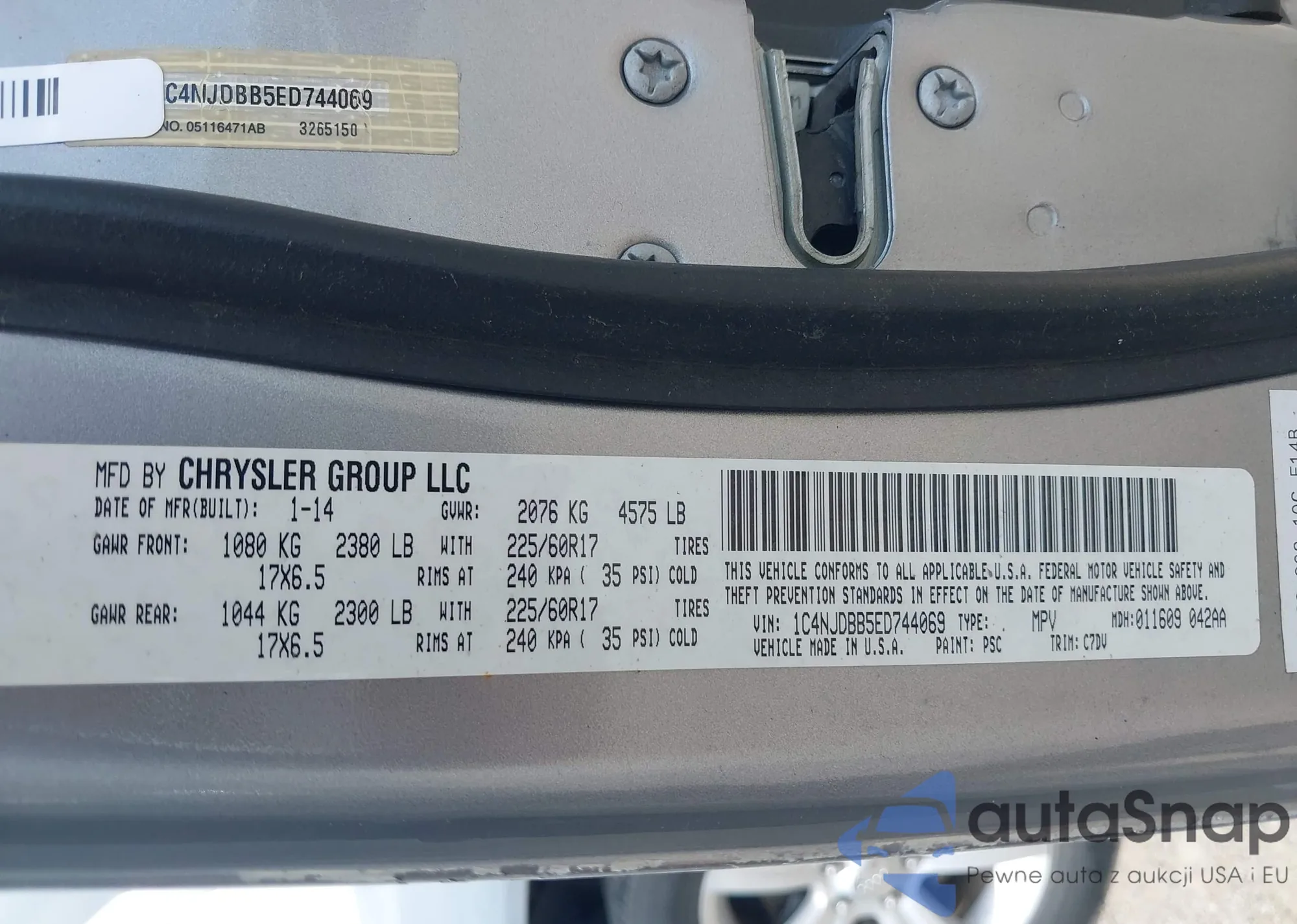 The car Jeep Compass 2014 (VIN 1C4NJDBB5ED744069) has not been auctioned before. The documents are clean, and the mileage matches or is below the market average. Sold by an insurance company – we recommend purchase. Delivery to the port will take approx. 6–8 weeks.