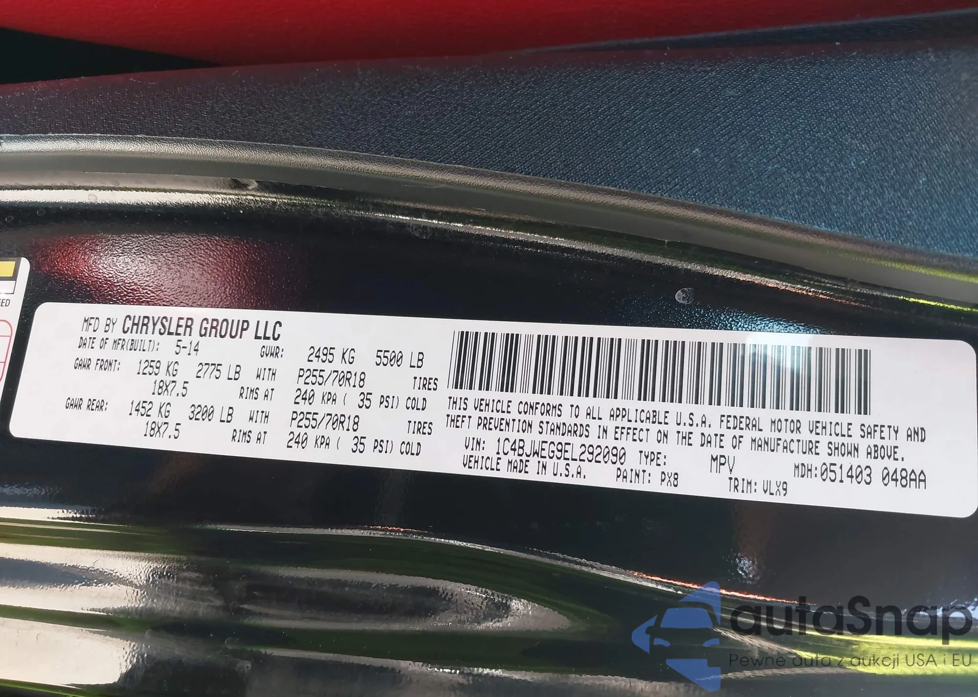 The car Jeep Wrangler 2014 (VIN 1C4BJWEG9EL292090) has not been auctioned before. The documents are clean, and the mileage matches or is below the market average. Sold by an insurance company – we recommend purchase. Delivery to the port will take approx. 6–8 weeks.
