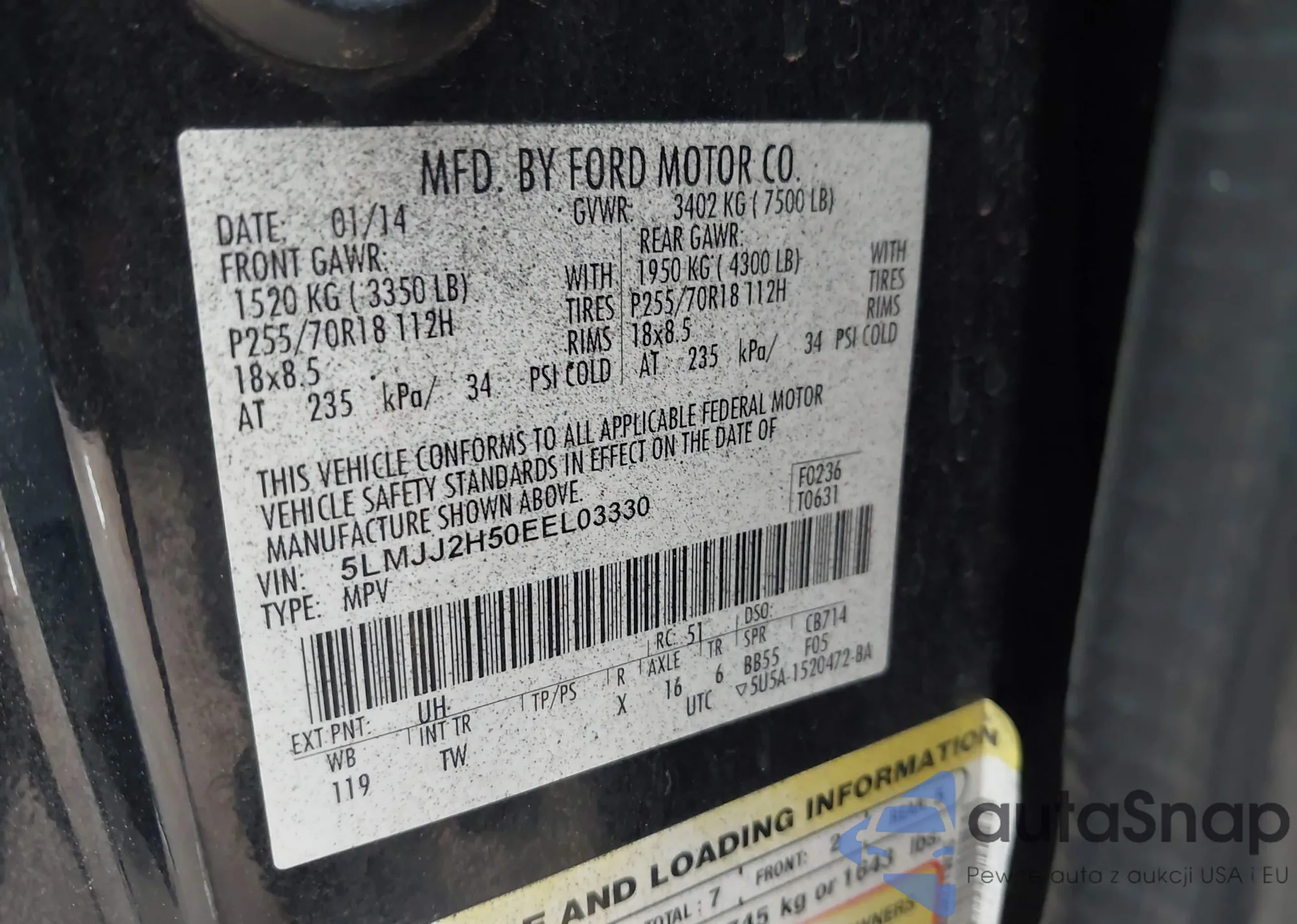 The car Lincoln Navigator 2014 (VIN 5LMJJ2H50EEL03330) has not been auctioned before. The documents are clean, and the mileage matches or is below the market average. Sold by an insurance company – we recommend purchase. Delivery to the port will take approx. 6–8 weeks.