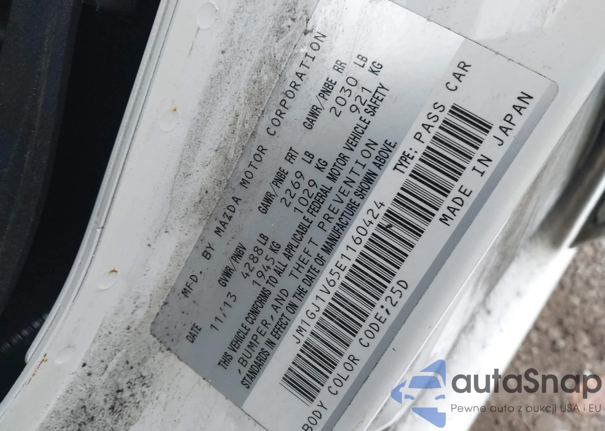The car Mazda 6 2014 (VIN JM1GJ1V65E1160424) has not been auctioned before. The documents are clean, and the mileage matches or is below the market average. Sold by an insurance company – we recommend purchase. Delivery to the port will take approx. 6–8 weeks.