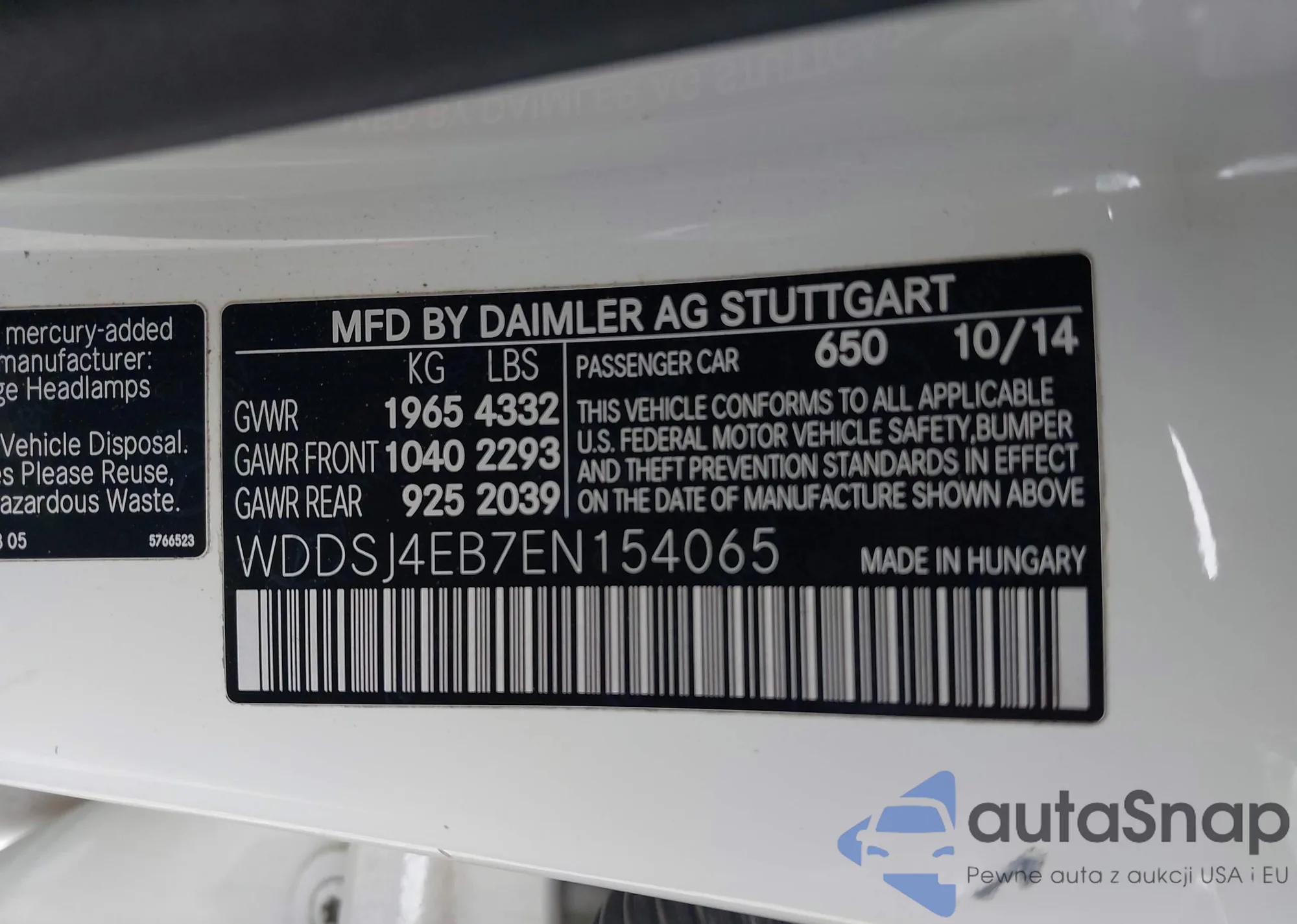 The car Mercedes-Benz CLA-klasse 2014 (VIN WDDSJ4EB7EN154065) has documents that prevent registration. Export and registration may be difficult. Contact AutaSnap experts to find alternatives.