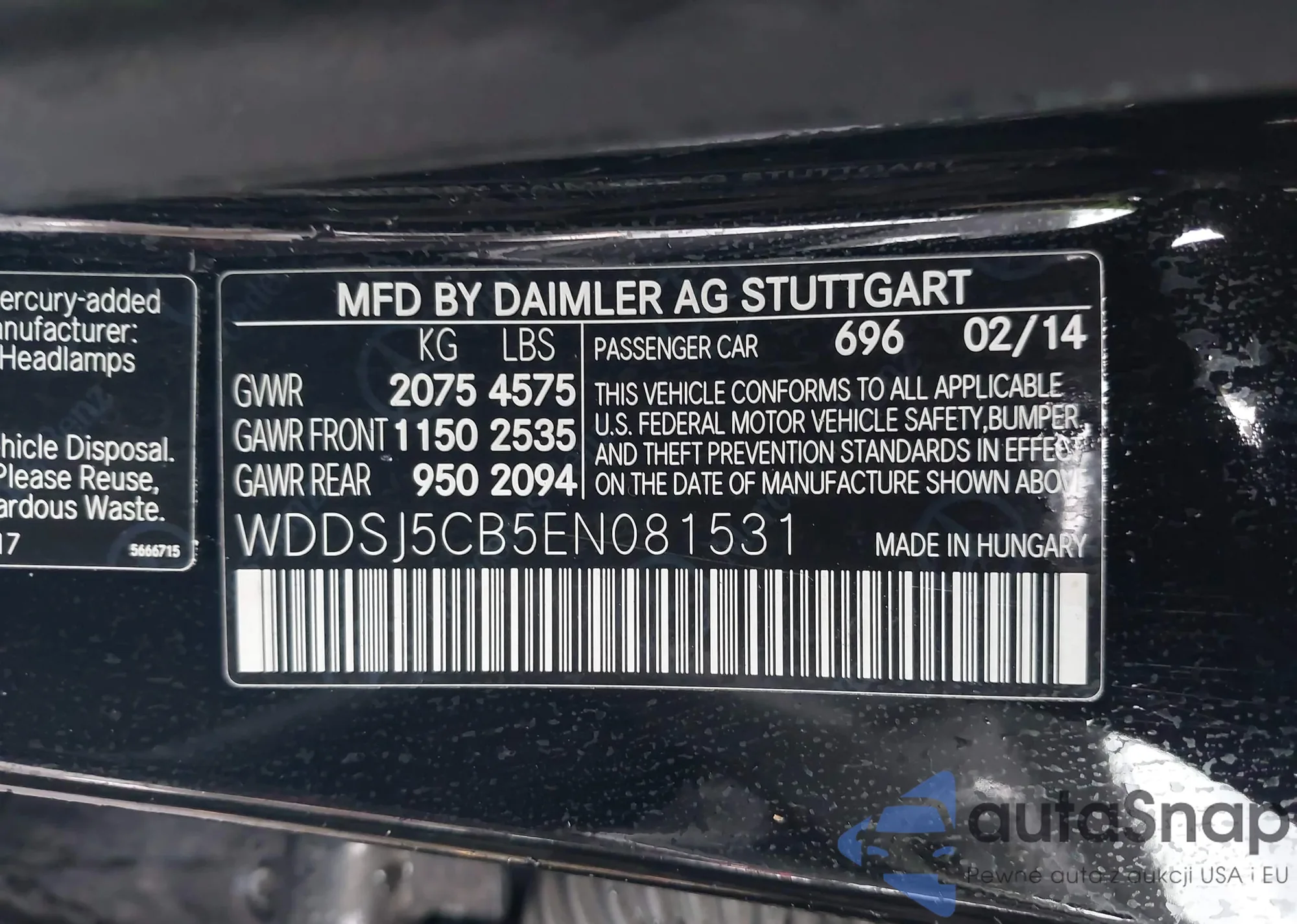 The car Mercedes-Benz CLA-klasse AMG 2014 (VIN WDDSJ5CB5EN081531) has documents that prevent registration. Export and registration may be difficult. Contact AutaSnap experts to find alternatives.