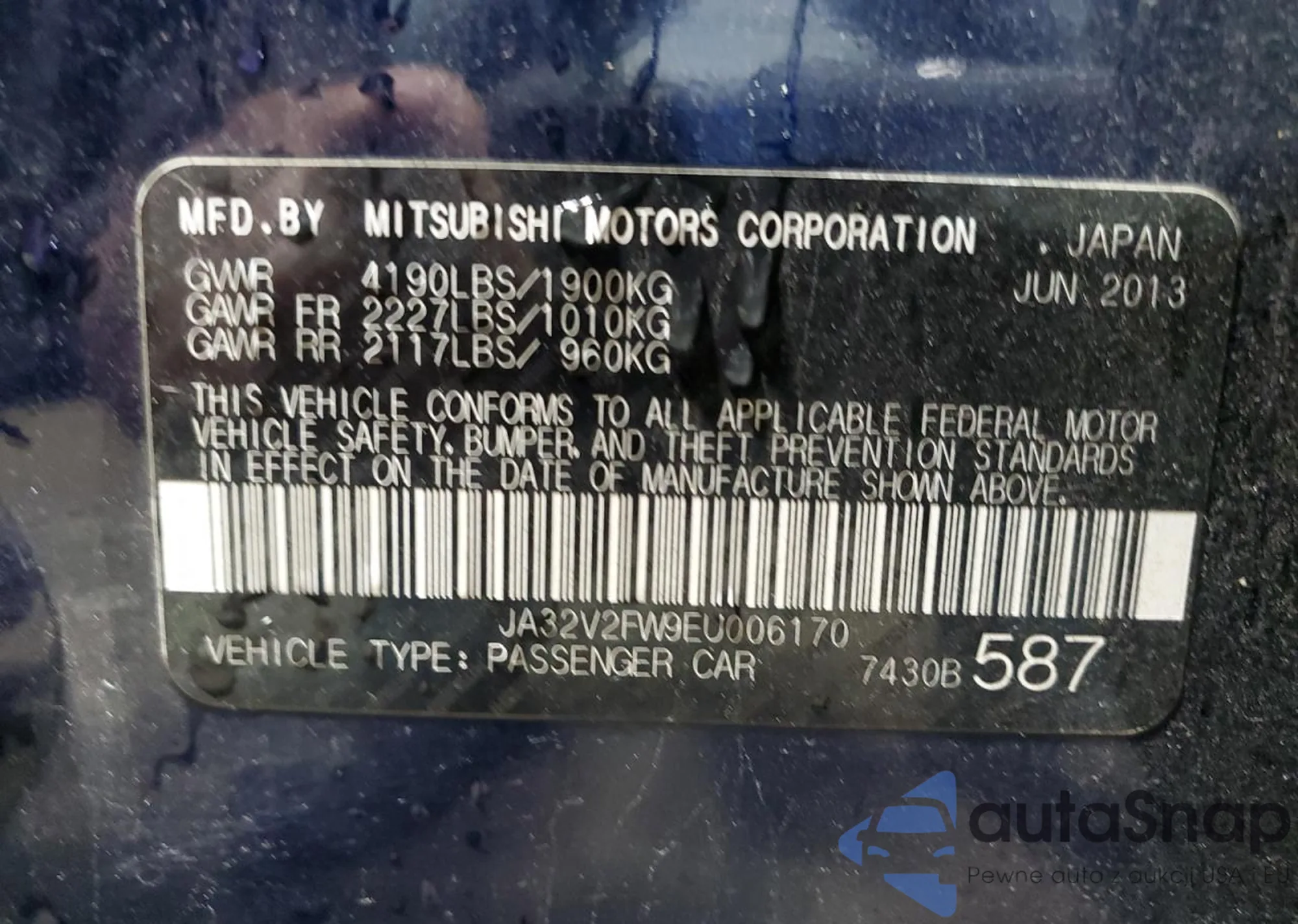 The car Mitsubishi Lancer 2014 (VIN JA32V2FW9EU006170) is sold by an unverified seller. We recommend checking the Carfax report and confirming registration possibilities before purchase.