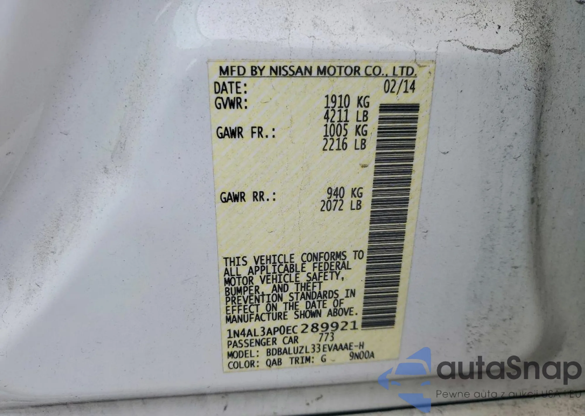 The car Nissan Altima 2014 (VIN 1N4AL3AP0EC289921) is sold by an unverified seller. We recommend checking the Carfax report and confirming registration possibilities before purchase.
