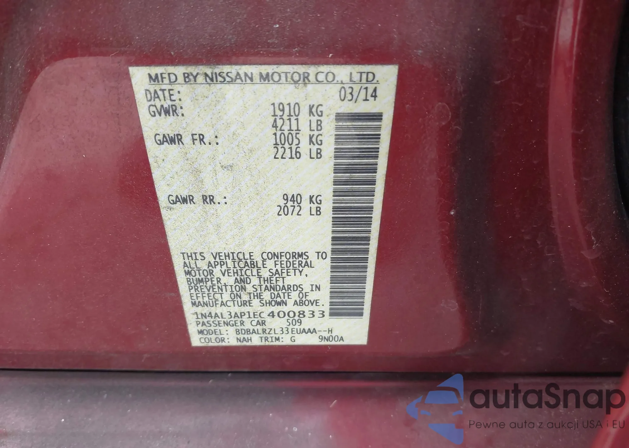 VIN: 1N4AL3AP1EC400833
