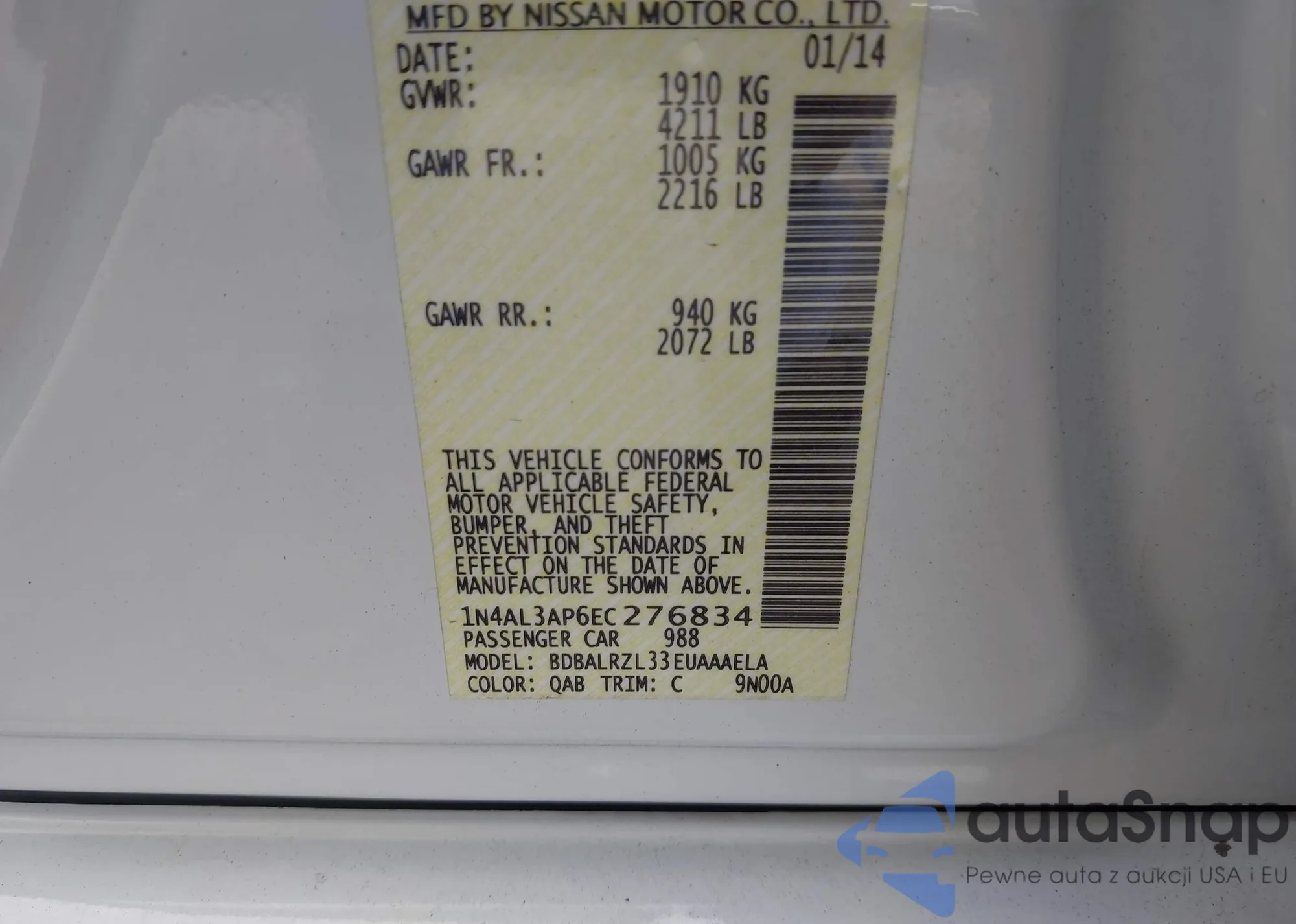 VIN: 1N4AL3AP6EC276834