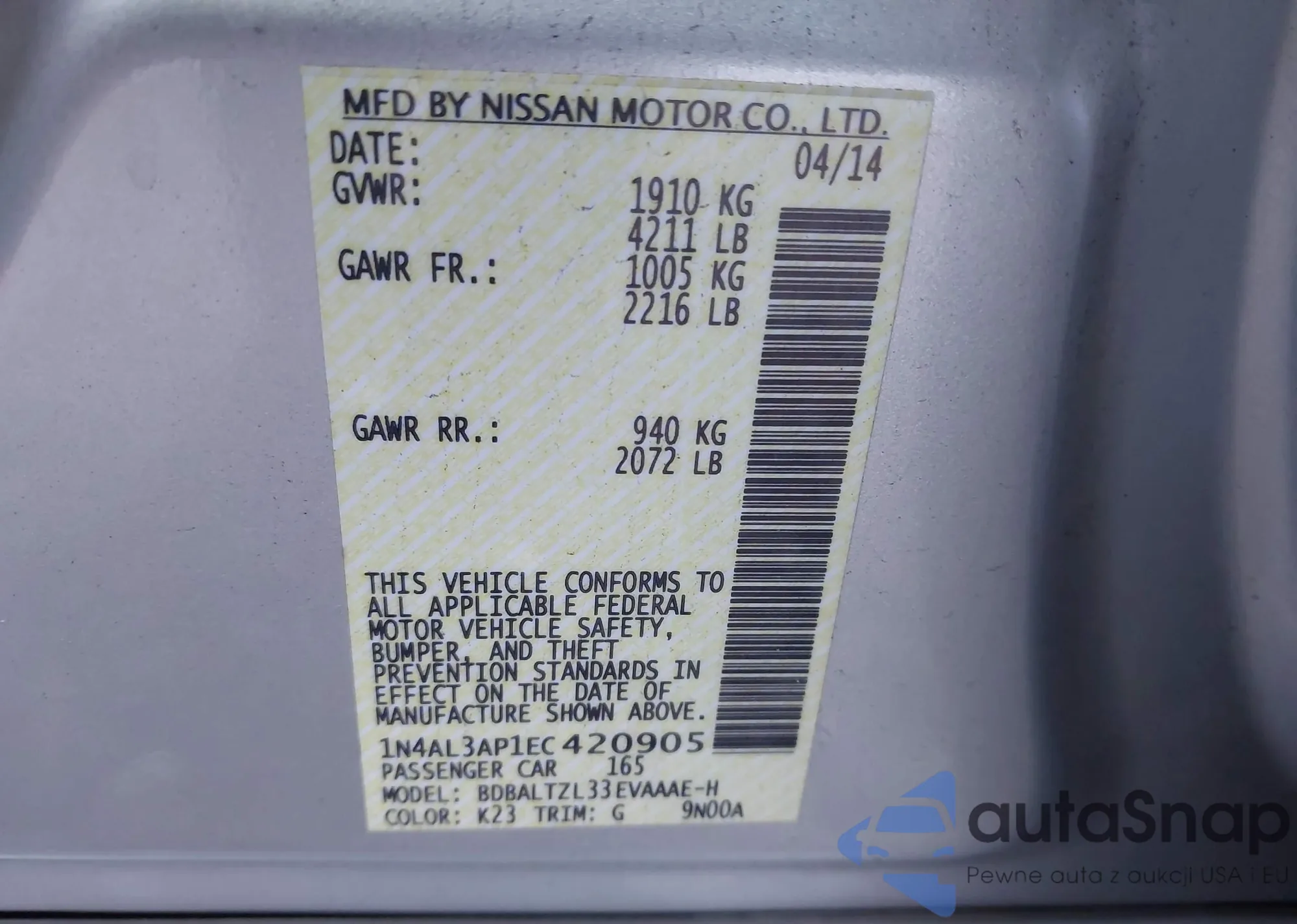 VIN: 1N4AL3AP1EC420905