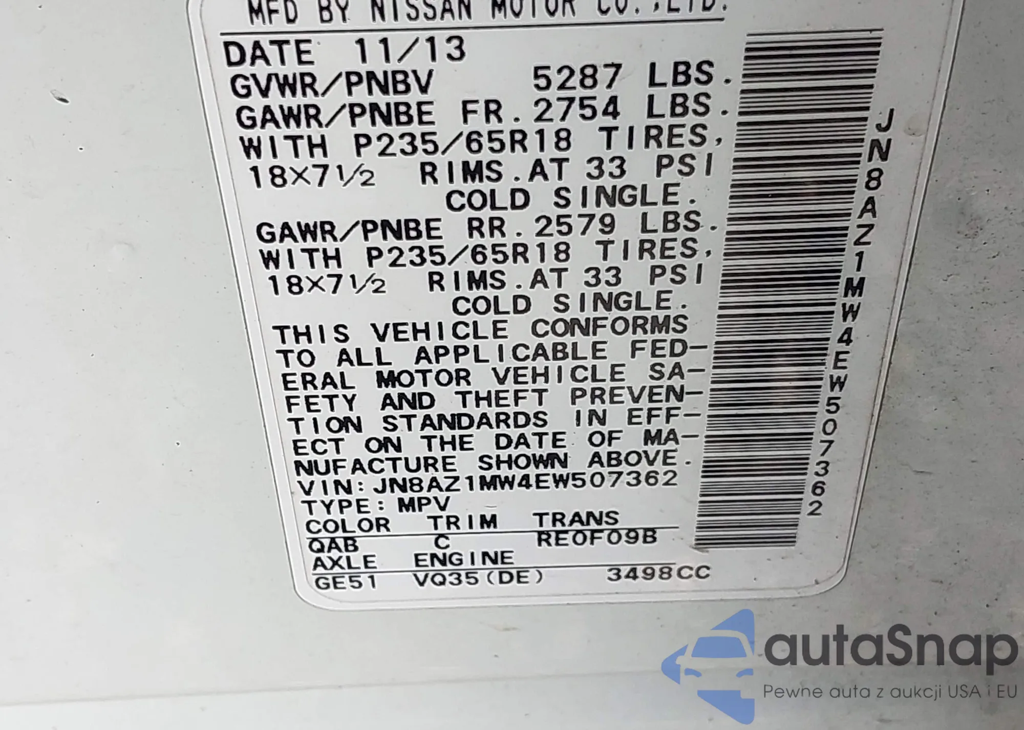 VIN: JN8AZ1MW4EW507362