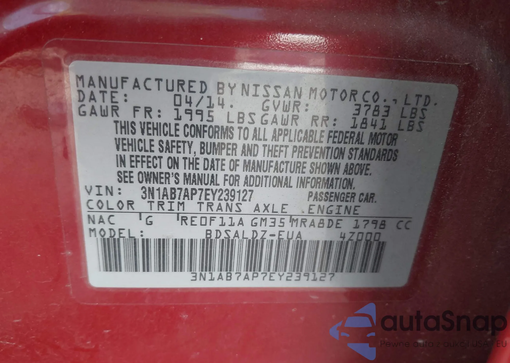 The car Nissan Sentra 2014 (VIN 3N1AB7AP7EY239127) has not been auctioned before. The documents are clean, and the mileage matches or is below the market average. Sold by an insurance company – we recommend purchase. Delivery to the port will take approx. 6–8 weeks.