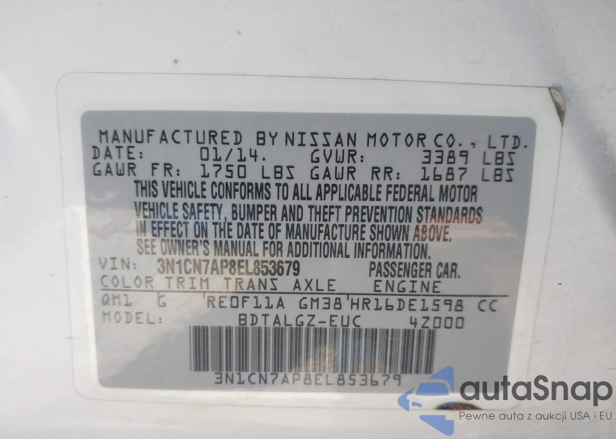 • VIN: 3N1CN7AP8EL853679