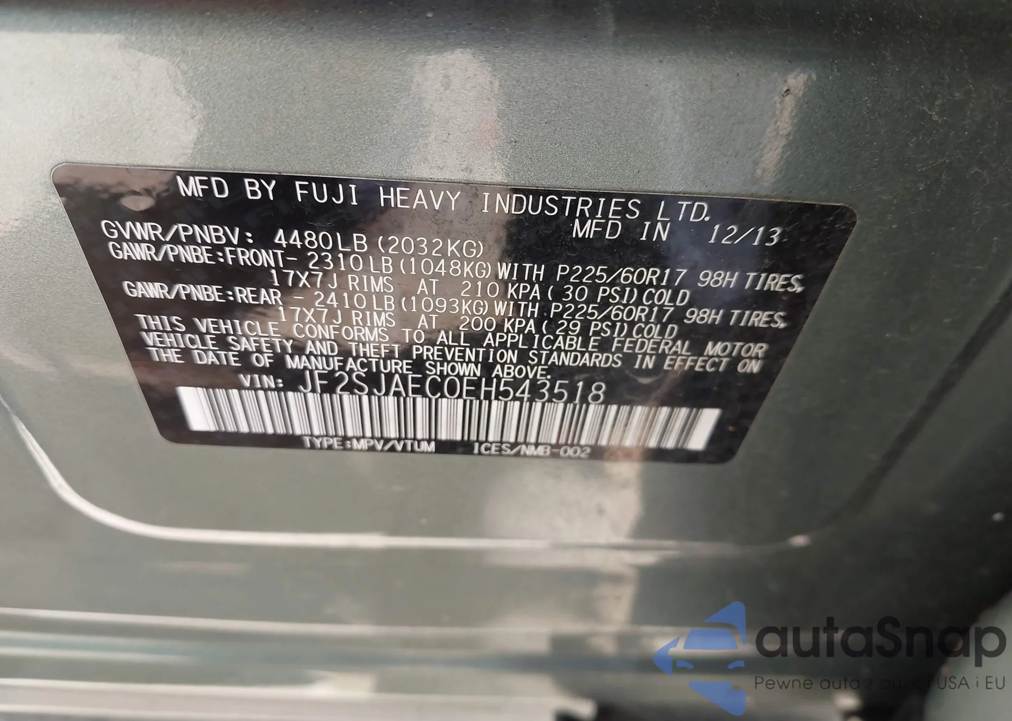 The car Subaru Forester 2014 (VIN JF2SJAEC0EH543518) has not been auctioned before. The documents are clean, and the mileage matches or is below the market average. Sold by an insurance company – we recommend purchase. Delivery to the port will take approx. 6–8 weeks.