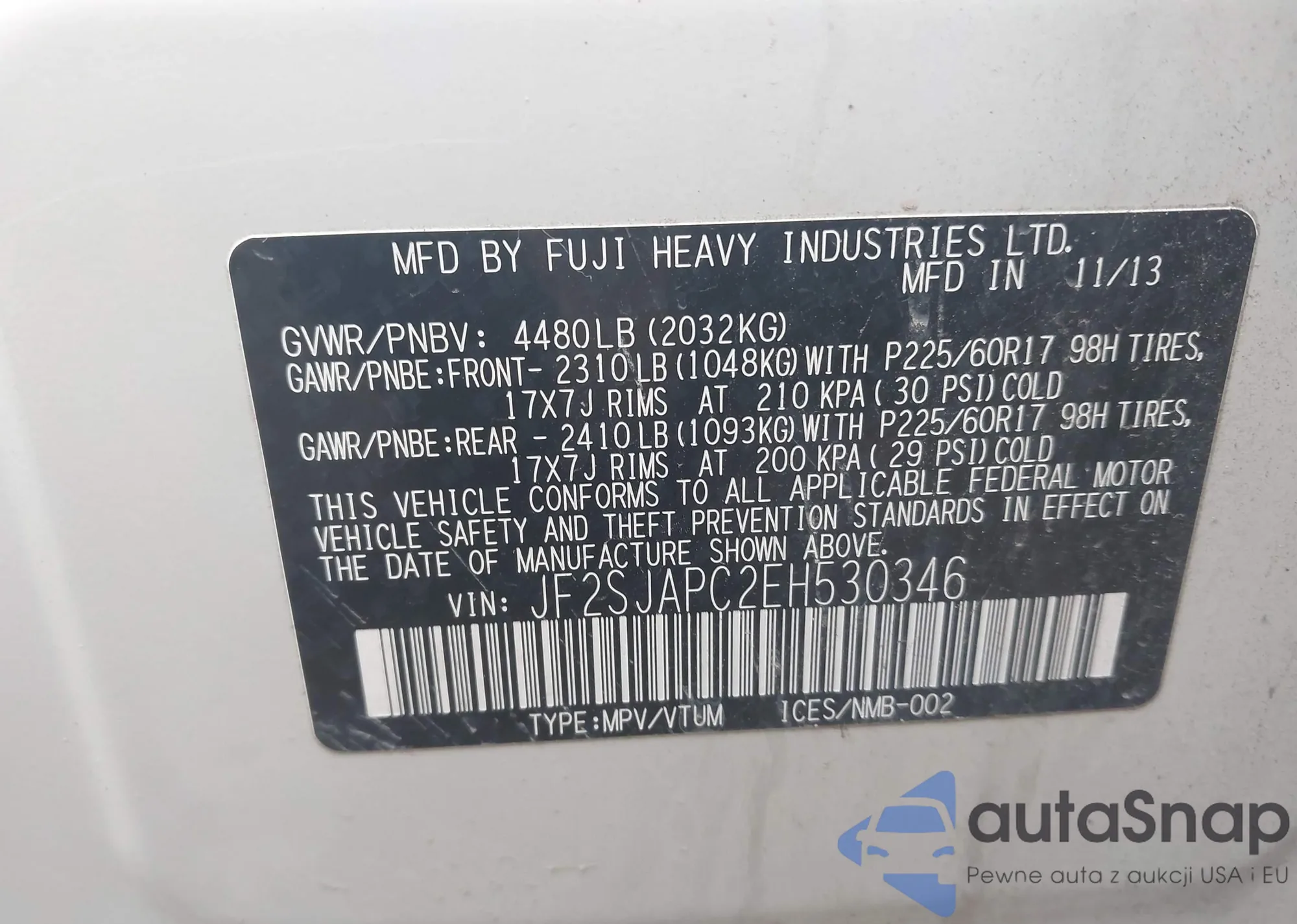 The car Subaru Forester 2014 (VIN JF2SJAPC2EH530346) has not been auctioned before. The documents are clean, and the mileage matches or is below the market average. Sold by an insurance company – we recommend purchase. Delivery to the port will take approx. 6–8 weeks.