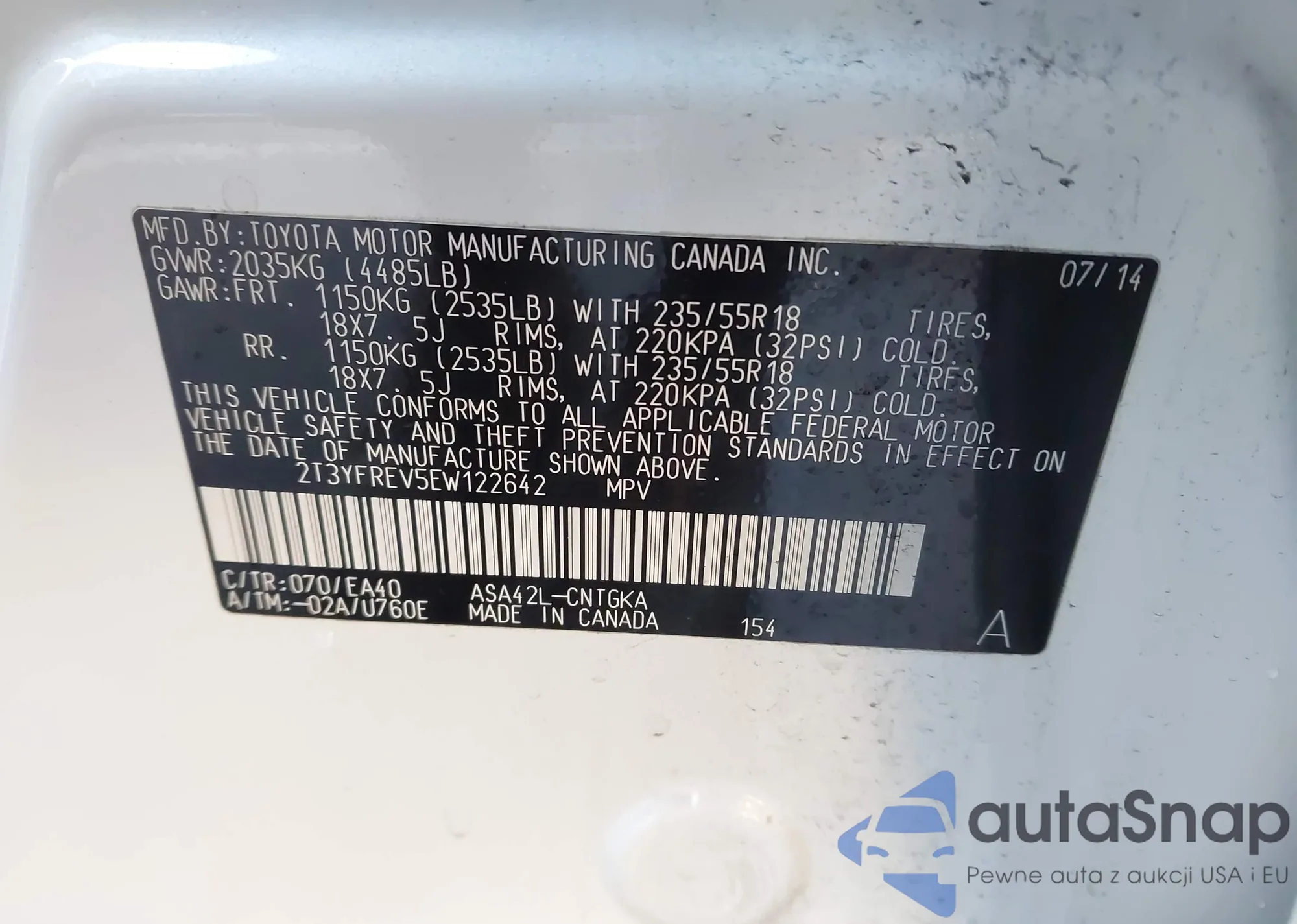 The car Toyota RAV 4 2014 (VIN 2T3YFREV5EW122642) has not been auctioned before. The documents are clean, and the mileage matches or is below the market average. Sold by an insurance company – we recommend purchase. Delivery to the port will take approx. 6–8 weeks.