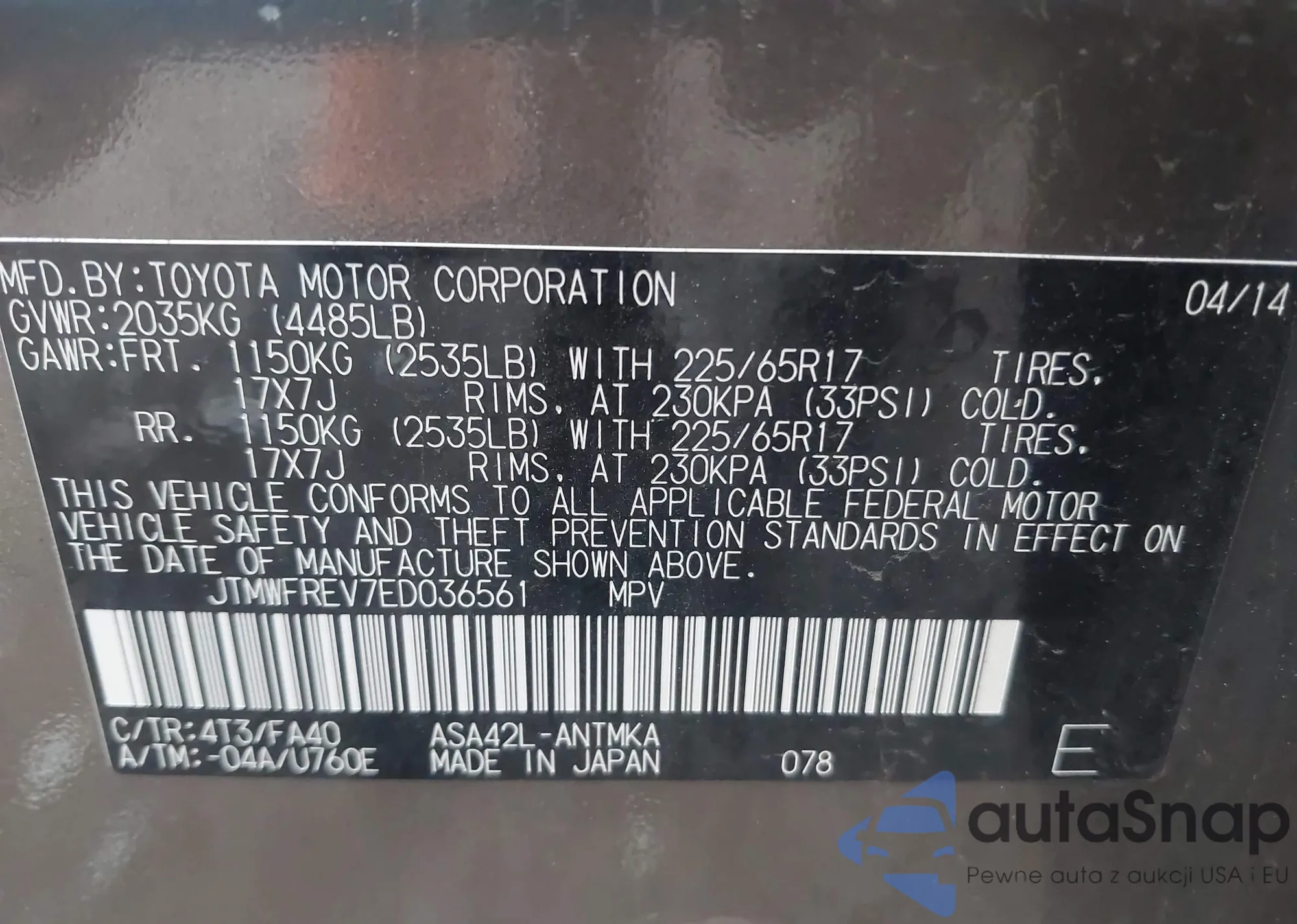 VIN: JTMWFREV7ED036561