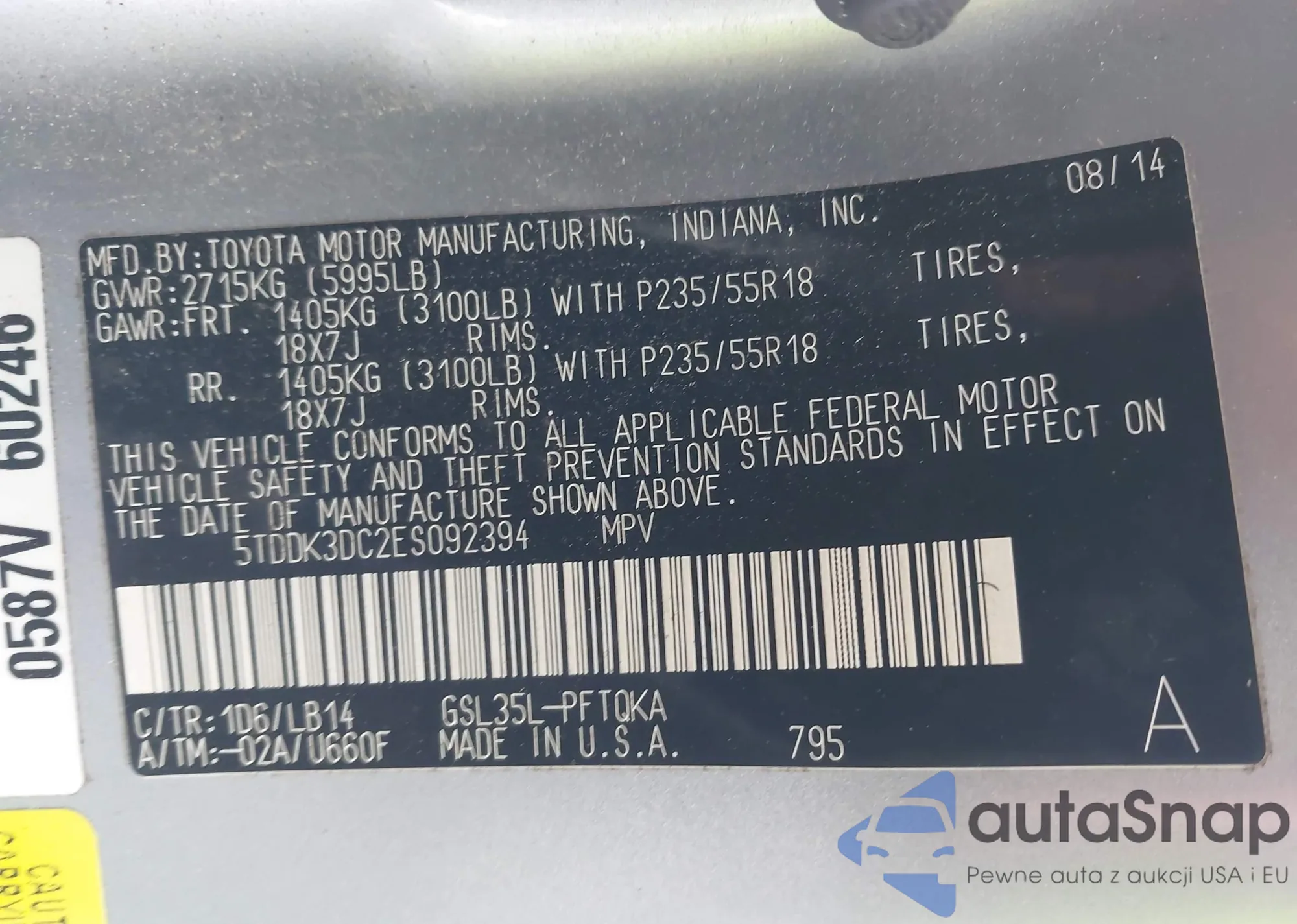 The car Toyota Sienna 2014 (VIN 5TDDK3DC2ES092394) has not been auctioned before. The documents are clean, and the mileage matches or is below the market average. Sold by an insurance company – we recommend purchase. Delivery to the port will take approx. 6–8 weeks.