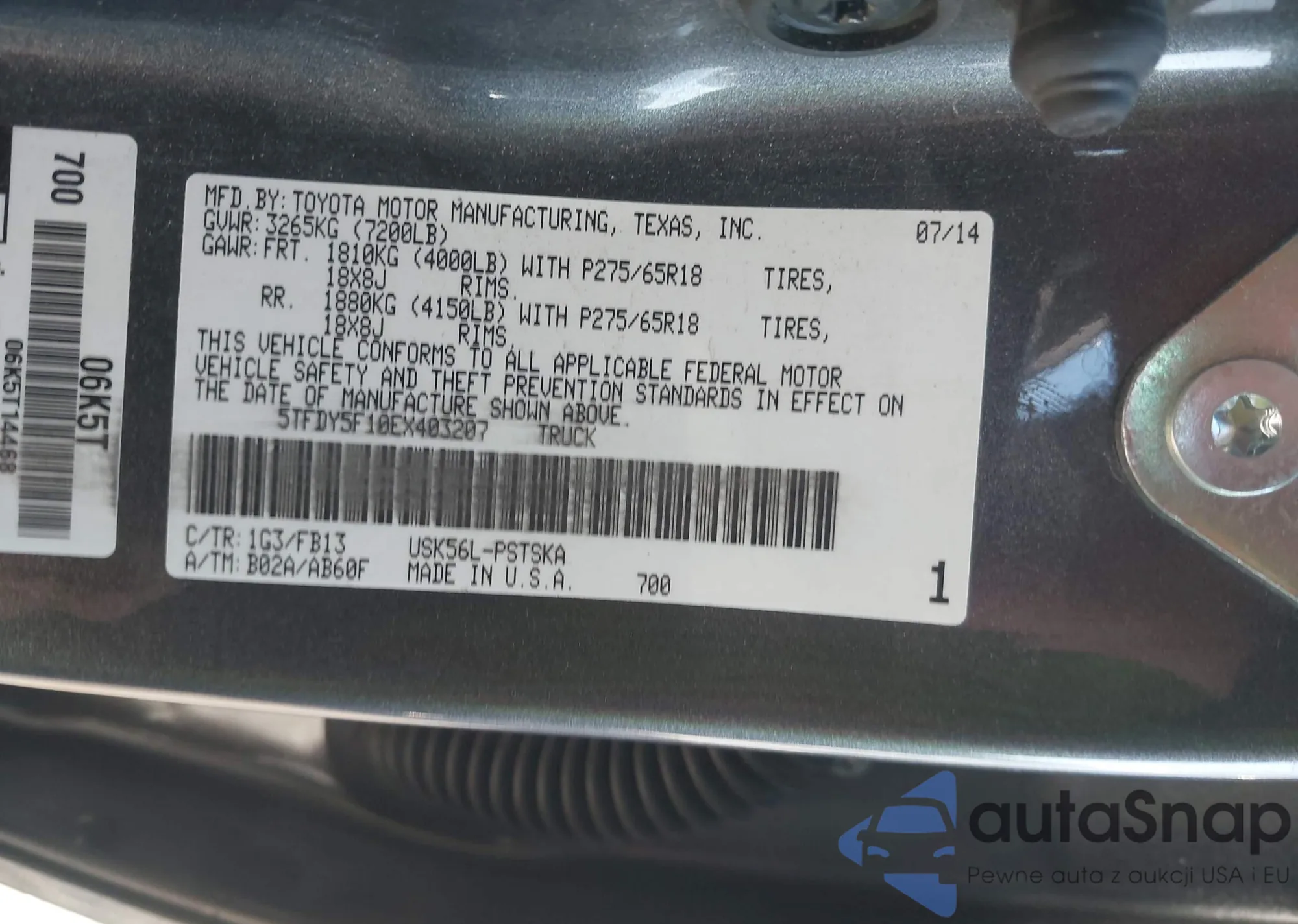 The car Toyota Tundra 2014 (VIN 5TFDY5F10EX403207) has not been auctioned before. The documents are clean, and the mileage matches or is below the market average. Sold by an insurance company – we recommend purchase. Delivery to the port will take approx. 6–8 weeks.