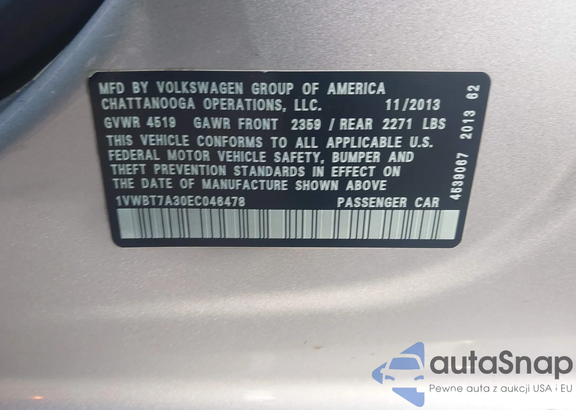 The car Volkswagen Passat 2014 (VIN 1VWBT7A30EC046478) has not been auctioned before. The documents are clean, and the mileage matches or is below the market average. Sold by an insurance company – we recommend purchase. Delivery to the port will take approx. 6–8 weeks.