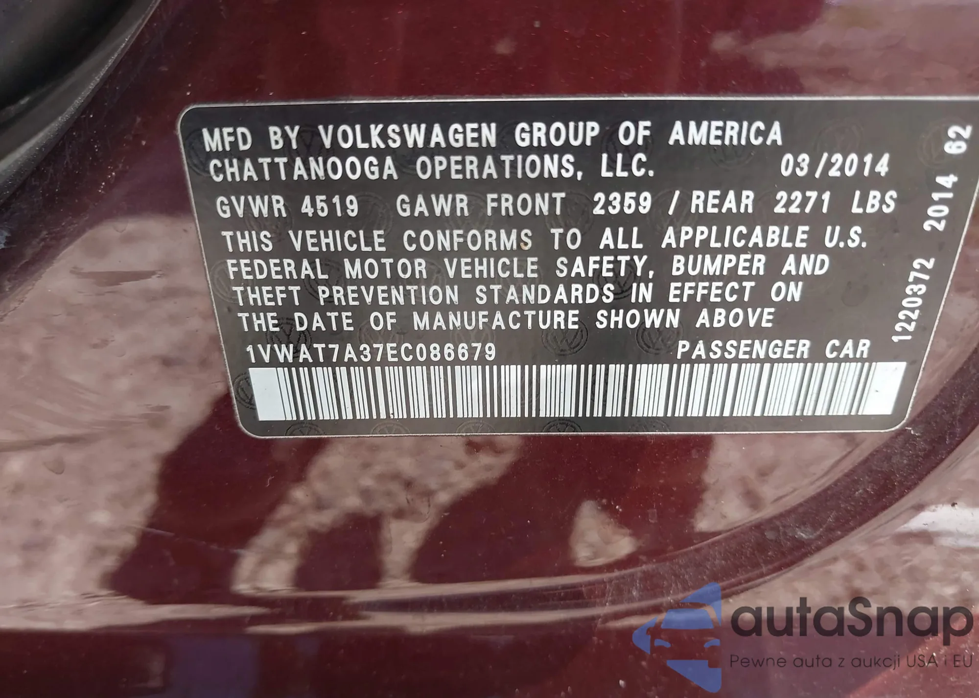 The car Volkswagen Passat 2014 (VIN 1VWAT7A37EC086679) is sold by an unverified seller. We recommend checking the Carfax report and confirming registration possibilities before purchase.