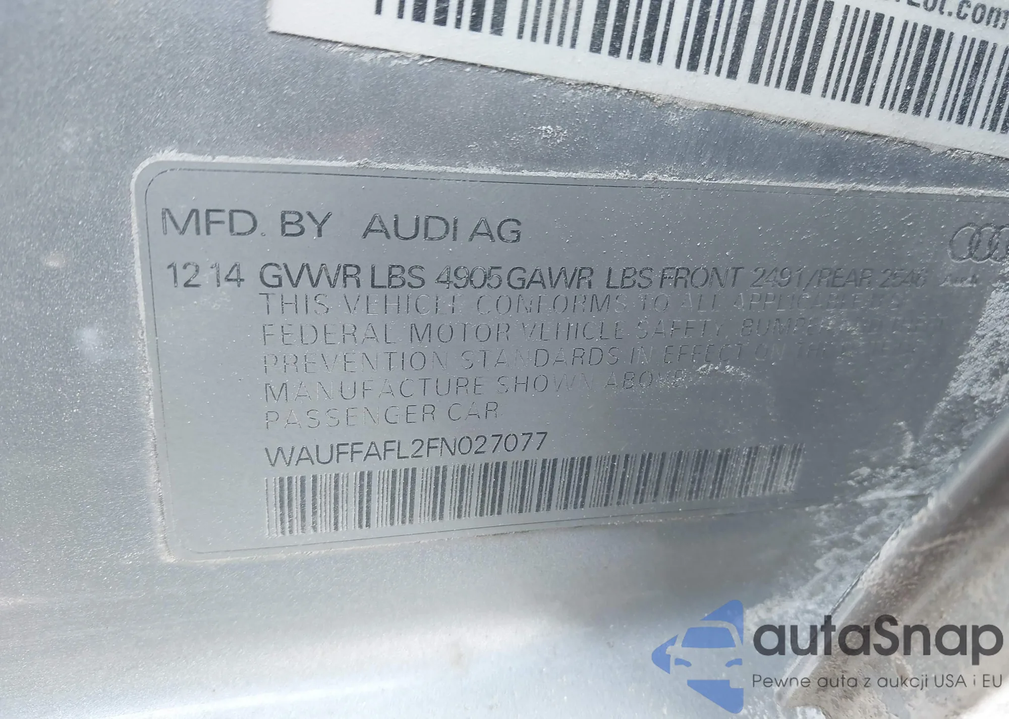 The car Audi A4 2015 (VIN WAUFFAFL2FN027077) has not been auctioned before. The documents are clean, and the mileage matches or is below the market average. Sold by an insurance company – we recommend purchase. Delivery to the port will take approx. 6–8 weeks.