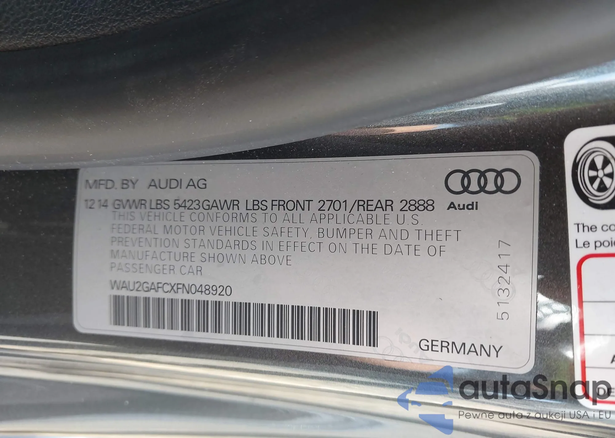 • VIN: WAU2GAFCXFN048920