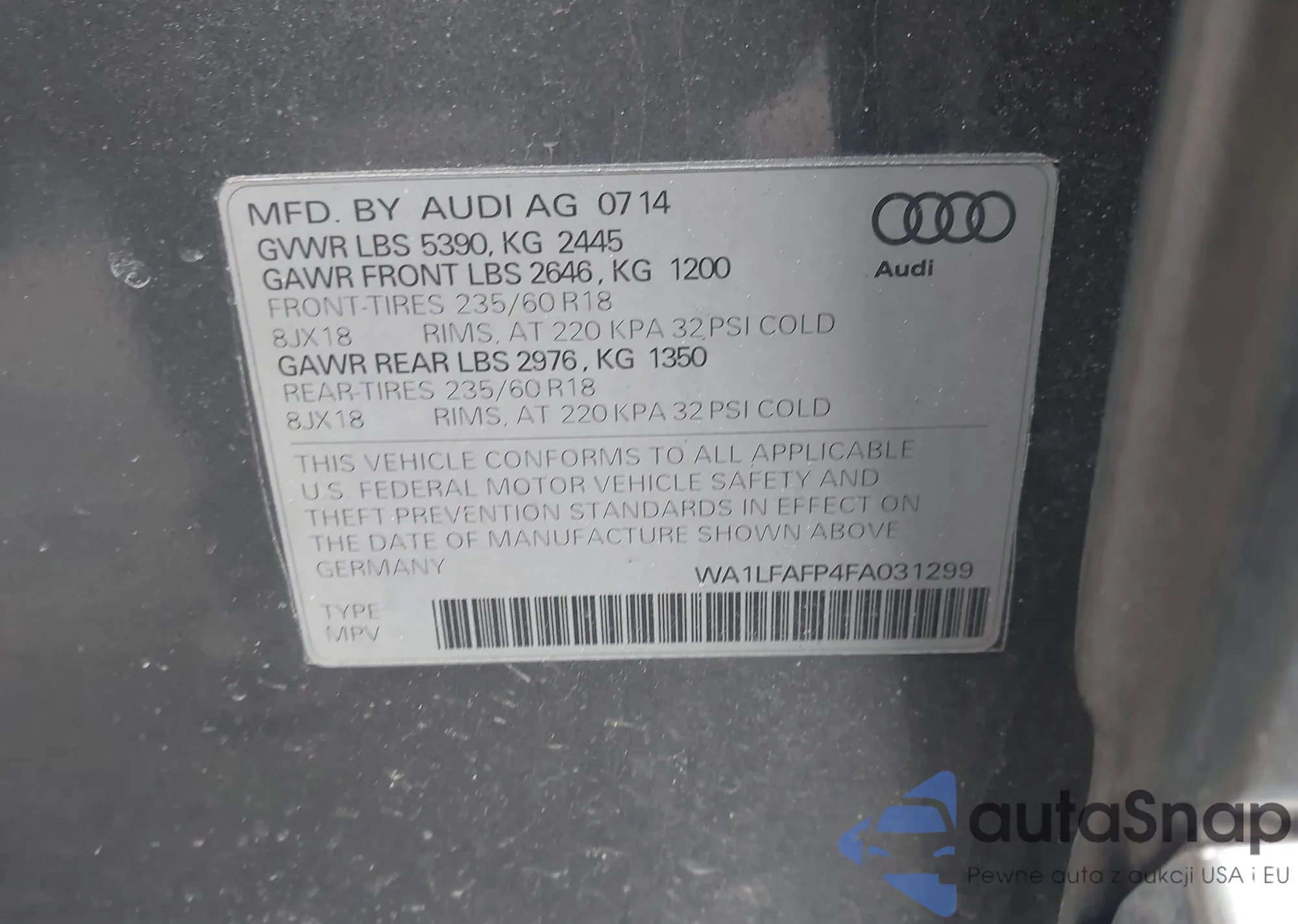 The car Audi Q5 2015 (VIN WA1LFAFP4FA031299) has not been auctioned before. The documents are clean, and the mileage matches or is below the market average. Sold by an insurance company – we recommend purchase. Delivery to the port will take approx. 6–8 weeks.