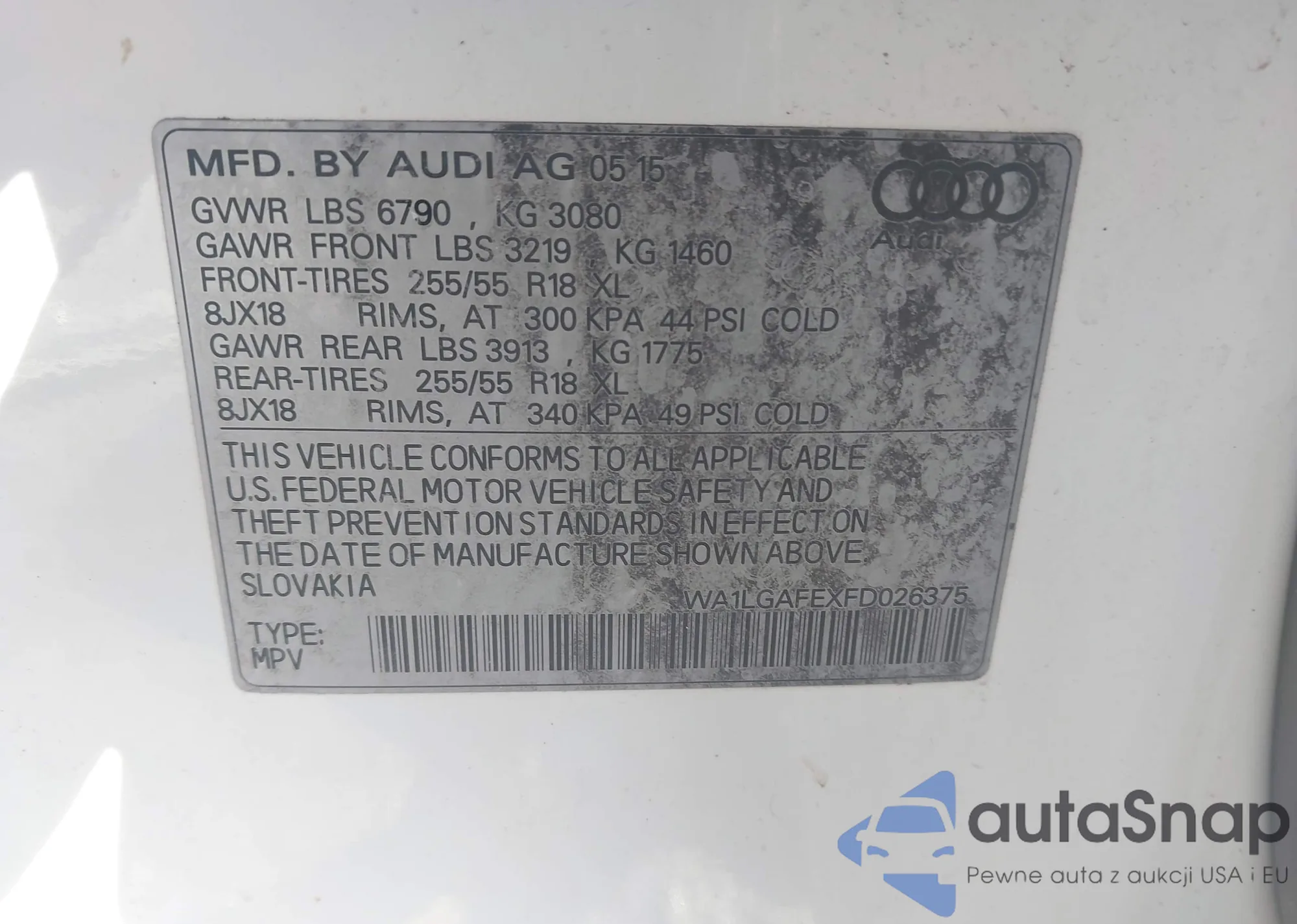 The car Audi Q7 2015 (VIN WA1LGAFEXFD026375) has not been auctioned before. The documents are clean, and the mileage matches or is below the market average. Sold by an insurance company – we recommend purchase. Delivery to the port will take approx. 6–8 weeks.