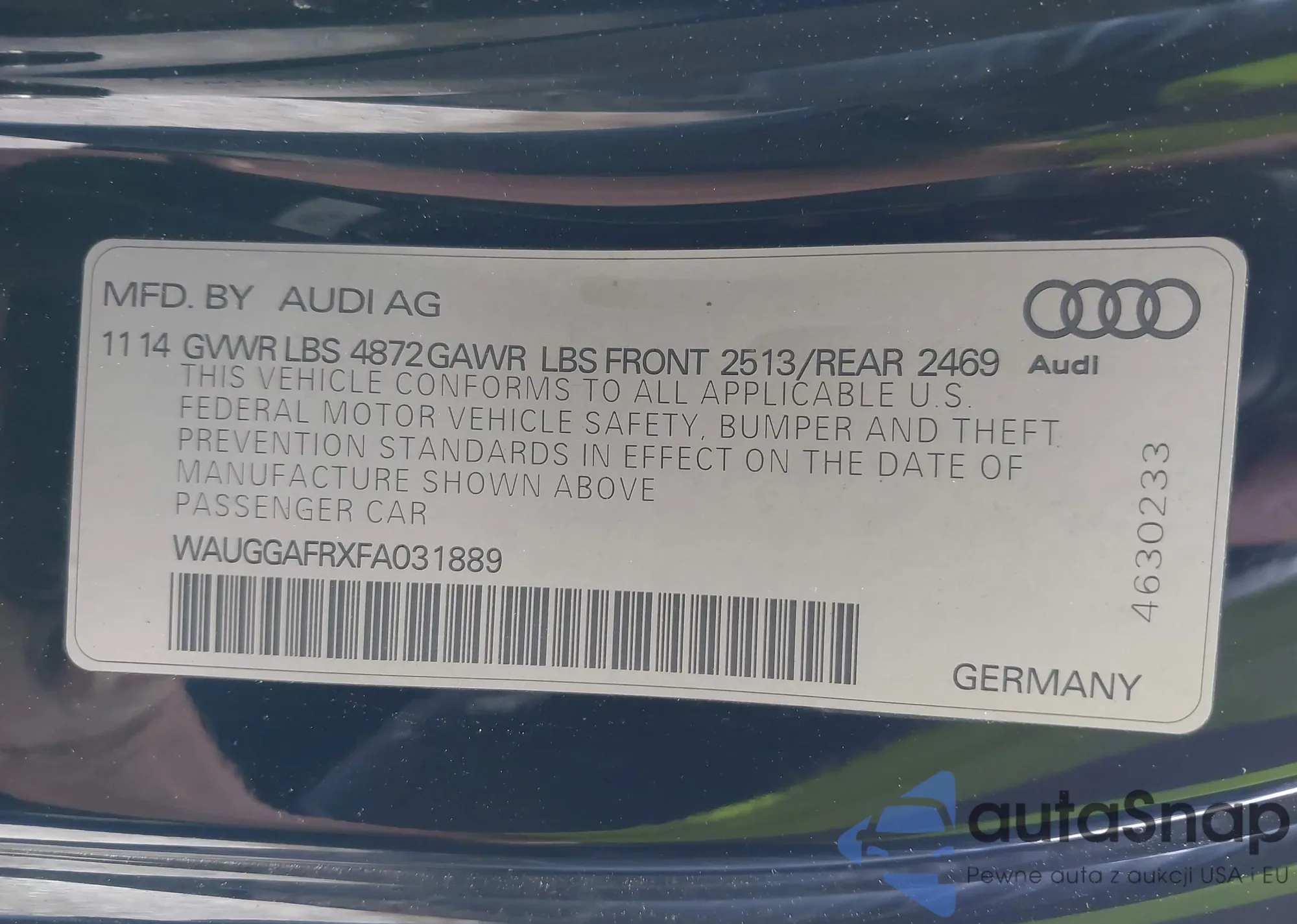• VIN: WAUGGAFRXFA031889