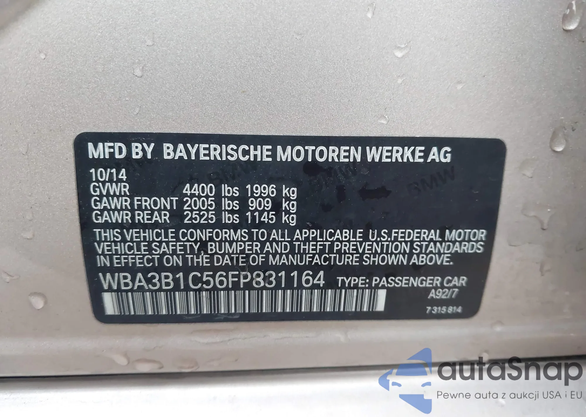 The car BMW 3er 2015 (VIN WBA3B1C56FP831164) has not been auctioned before. The documents are clean, and the mileage matches or is below the market average. Sold by an insurance company – we recommend purchase. Delivery to the port will take approx. 6–8 weeks.