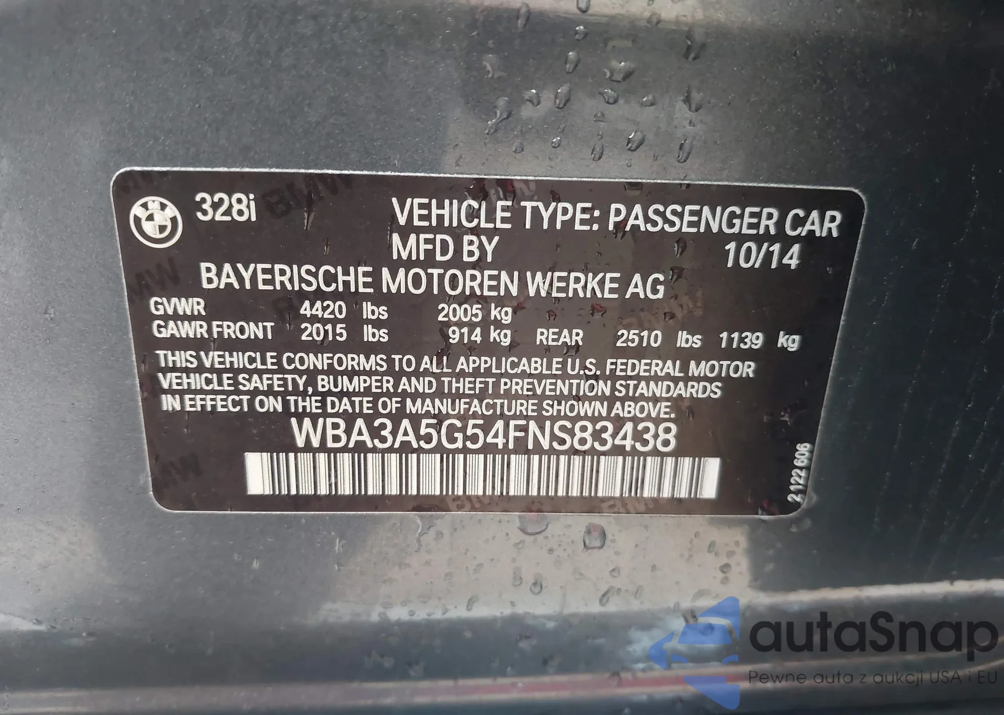 The car BMW 3er 2015 (VIN WBA3A5G54FNS83438) has not been auctioned before. The documents are clean, and the mileage matches or is below the market average. Sold by an insurance company – we recommend purchase. Delivery to the port will take approx. 6–8 weeks.