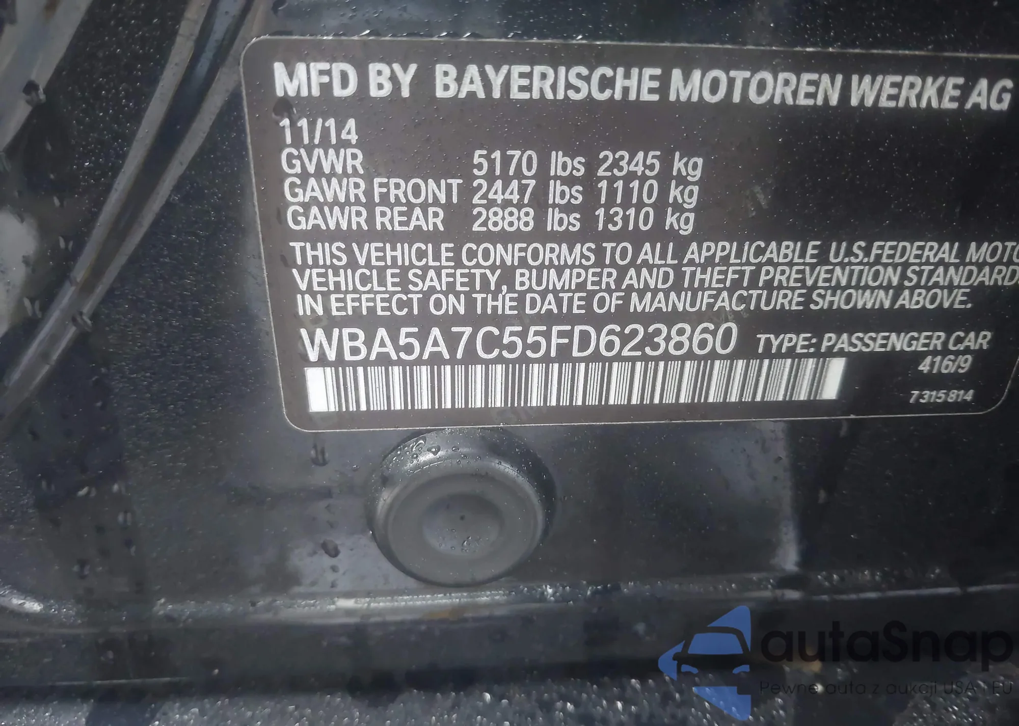 The car BMW 5er 2015 (VIN WBA5A7C55FD623860) has not been auctioned before. The documents are clean, and the mileage matches or is below the market average. Sold by an insurance company – we recommend purchase. Delivery to the port will take approx. 6–8 weeks.